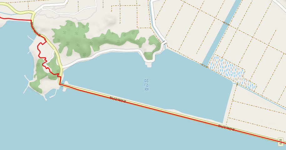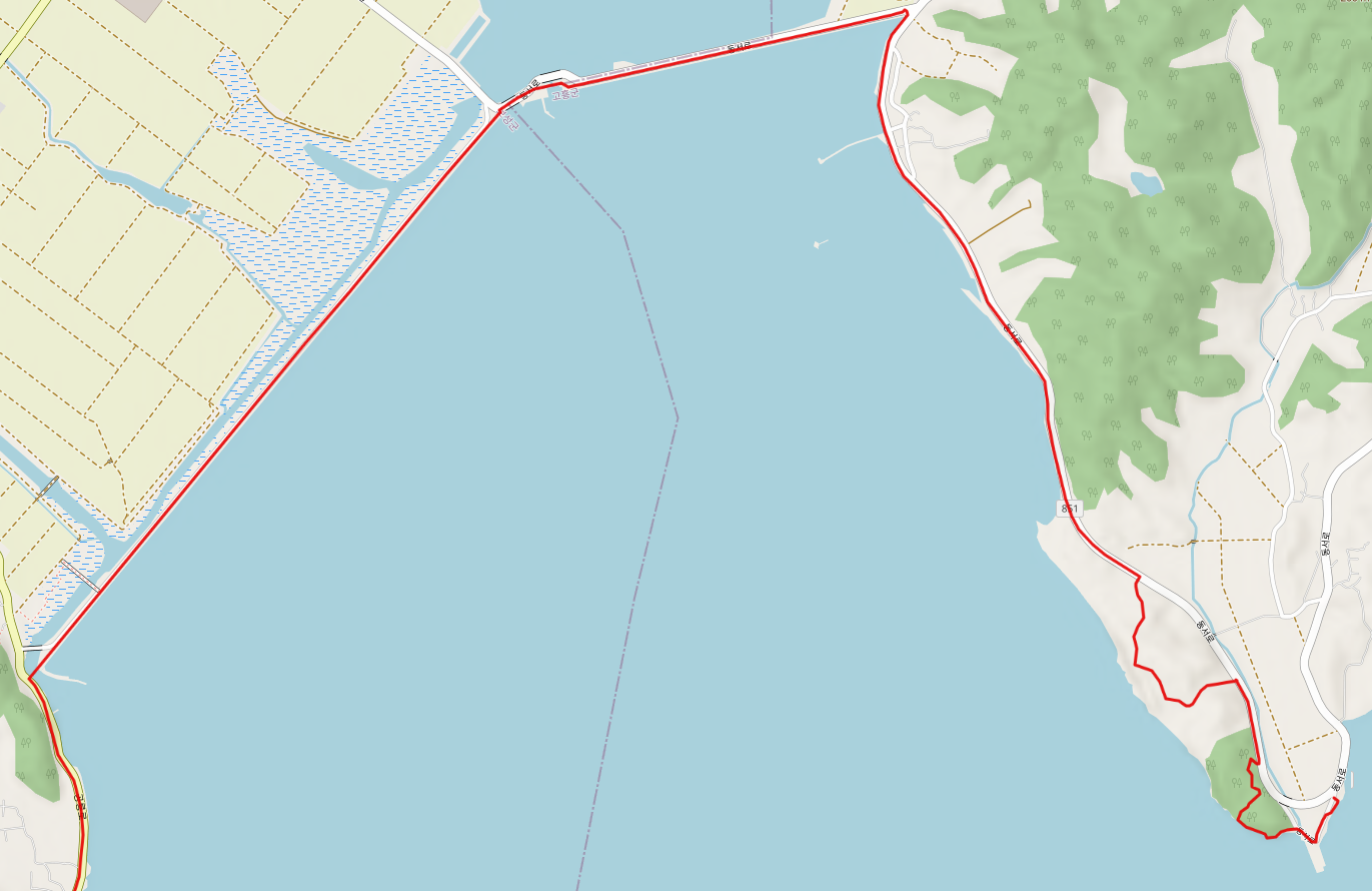 지난 여행에서 신기마을 수문동 정류장에서 장선 해수욕장을 거쳐 장선포까지 약 4.3Km를 걸었으므로 76코스에서 남은 거리는 9.6Km 정도이다. 장선포 포구를 떠나면 조성천과 득량천을 가로막고 있는 득량만 방조제 위를 걸어서 고흥군에서 보성군으로 넘어간다. 우측으로는 넓은 평야지대를 좌측으로는 득량만 바다를 보면서 걷는다. 방조제를 지나면 바로 해평선착장(9.7Km)에 닿는다.