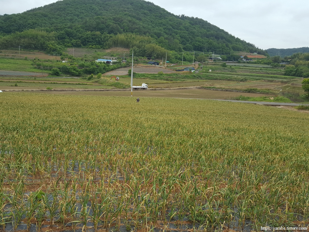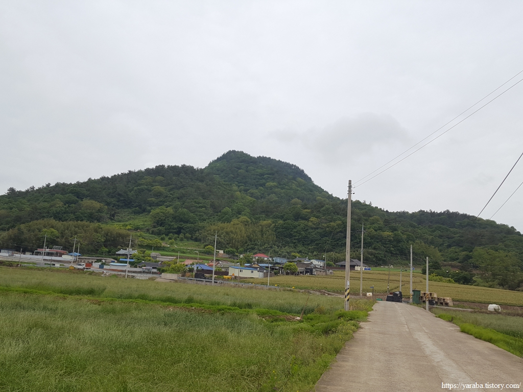거군 마을 인근에 이르니 전면으로 제왕산과 오도를 잇고 있는 오도 1 방조제가 보이기 시작한다. 그 옛날 여기도 바닷물이 들어오는 갯벌이었을 것이다. 논이 마치 가을 추수 때처럼 짚이 가지런히 놓여 있는데 볏짚이 아니라 소먹이용 풀을 베어서 건조하고 있는 상태다. 어느 정도 말리면 트랙터를 몰고 와서 둘둘 말아 공룡알로 만들 것이다.