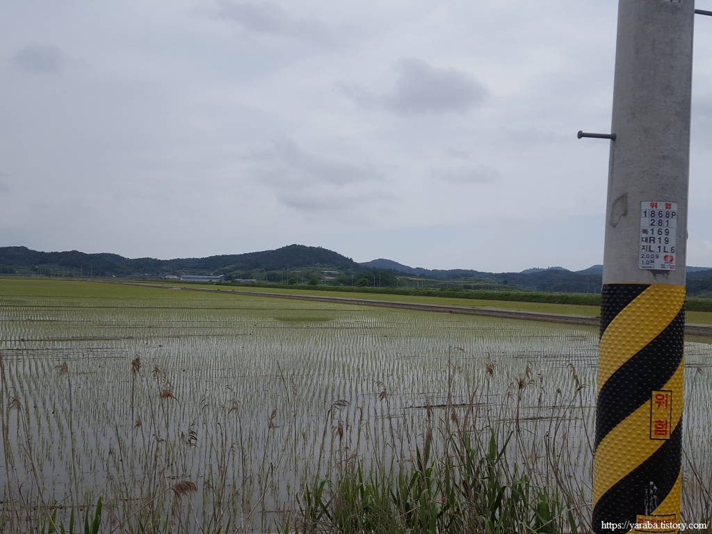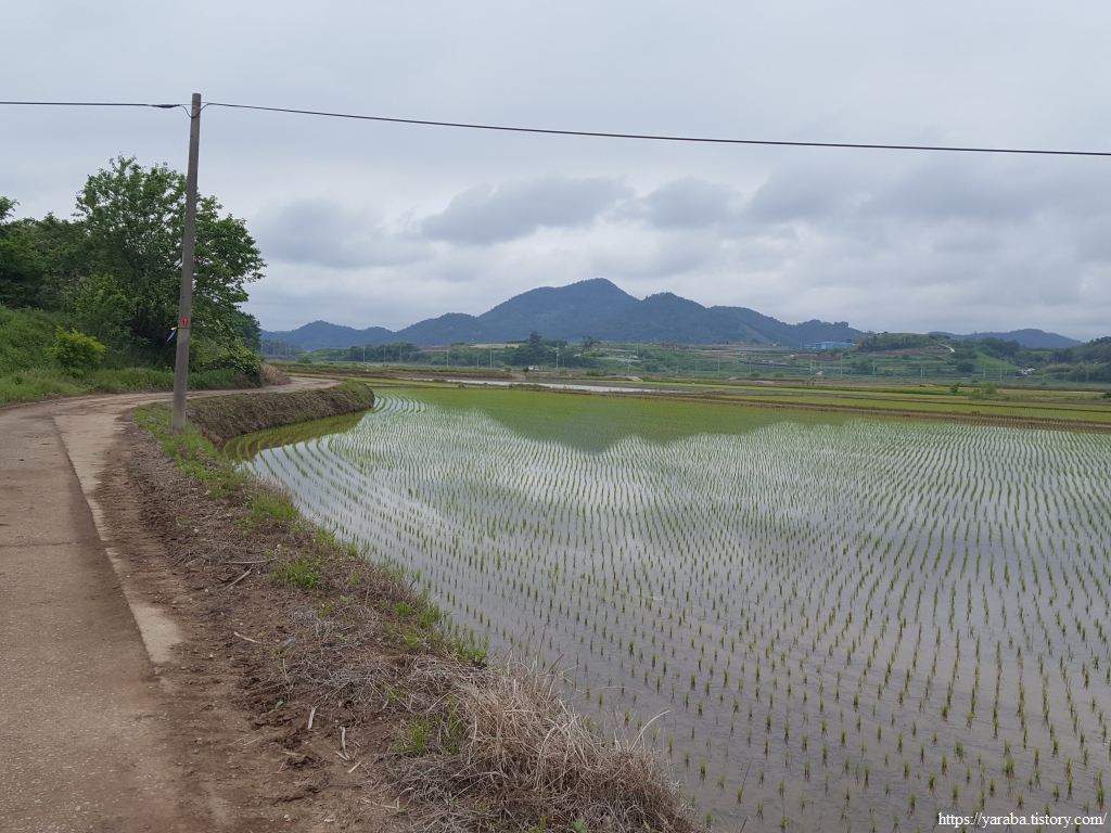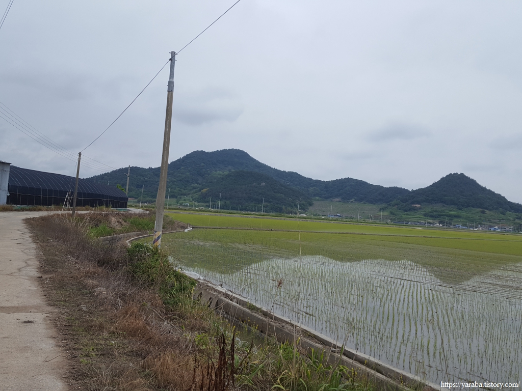 장동 마을을 벗어나면 구불구불 이어진 농로를 따라서 해안으로 나간다. 모내기가 끝난 논들은 마치 거울처럼 하늘과 주변 산들을 비추고 있다.