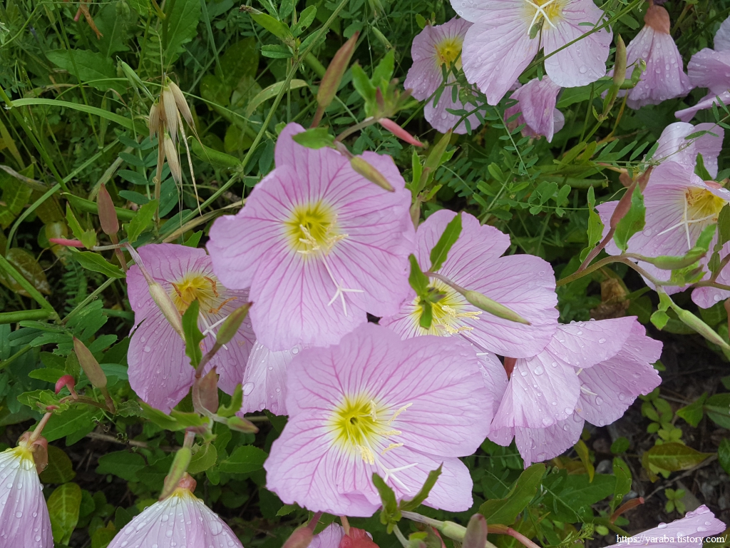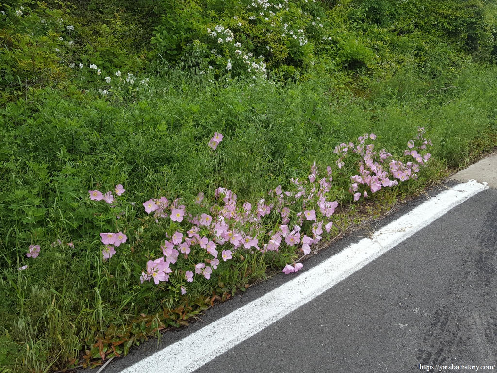 길가에서 분홍달맞이꽃을 만났다. 노란 달맞이꽃은 이름처럼 밤에 달빛을 받으며 꽃을 피우지만 분홍달맞이꽃은 반대로 낮에 꽃을 피운다.