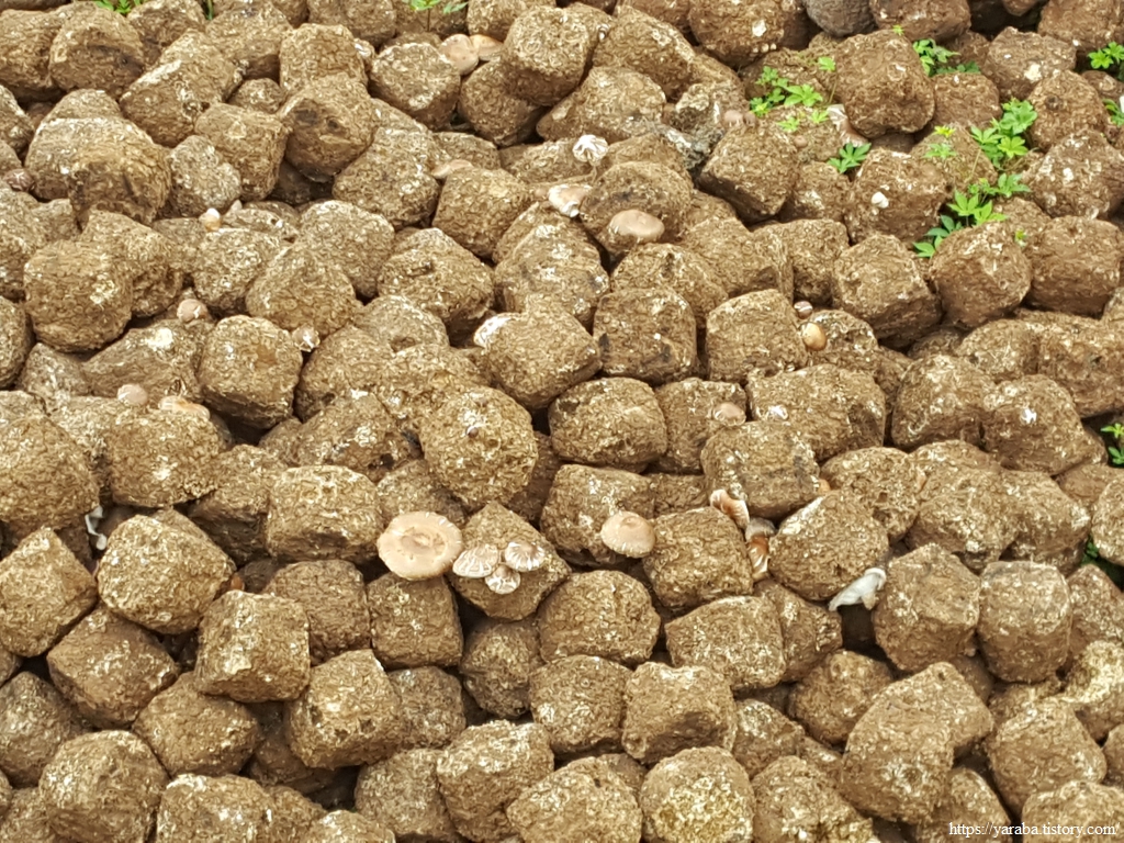 도로를 따라서 고갯길을 오르는데 길 좌측에 이상한 물건들이 쌓여 있었다. 주먹만 한 덩어리들이었는데 자세히 보니 표고버섯이 매달려 있었다. 아마도 표고버섯을 재배하는 농가에서 톱밥 표고 재배 후에 버린 톱밥배지인 모양이다. 비닐봉지에 활엽수 톱밥을 넣고 배양 및 접종하면 2~3회 표고를 딸 수 있다고 한다. 그냥 보아도 참나무에 구멍 뚫어 표고를 재배하는 것과 비교하면 생산성 차이가 엄청나 보인다. 대만이나 중국에서는 굳이 무균실과 항온항습실과 같은 시설 없이도 적절한 기온이 맞으면 톱밥 배지를 가져다가 자연 상태로 키운다고 한다. 몇 해 전 표고를 접종한 참나무를 어렵게 구했었지만 제대로 표고를 구경도 못해보고 나무가 썩혔던 기억이 있는데 톱밥 배지로 다시 시도해 볼까? 하는 생각으로 온라인 마켓을 뒤져보면 톱밥배지 하나 가격으로 마트에서 표고버섯을 사는 것이 훨씬 저렴한 것이 현실이다. 농민들은 버섯을 수확하는 비용이라도 건질 수 있을지......