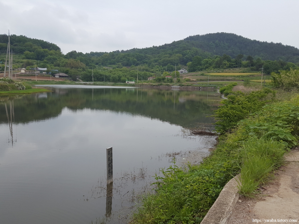 길은 거군지라는 작은 저류지를 돌아서 오도 1 방조제 둑방길을 걷는다.