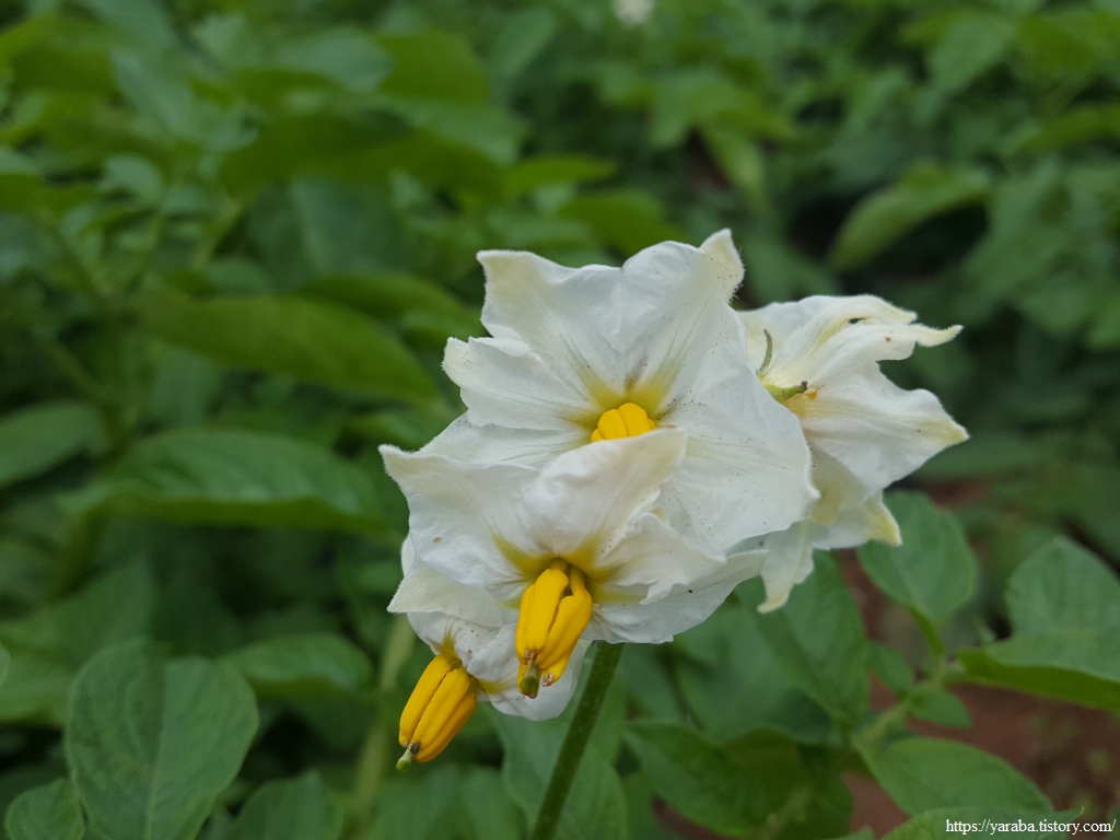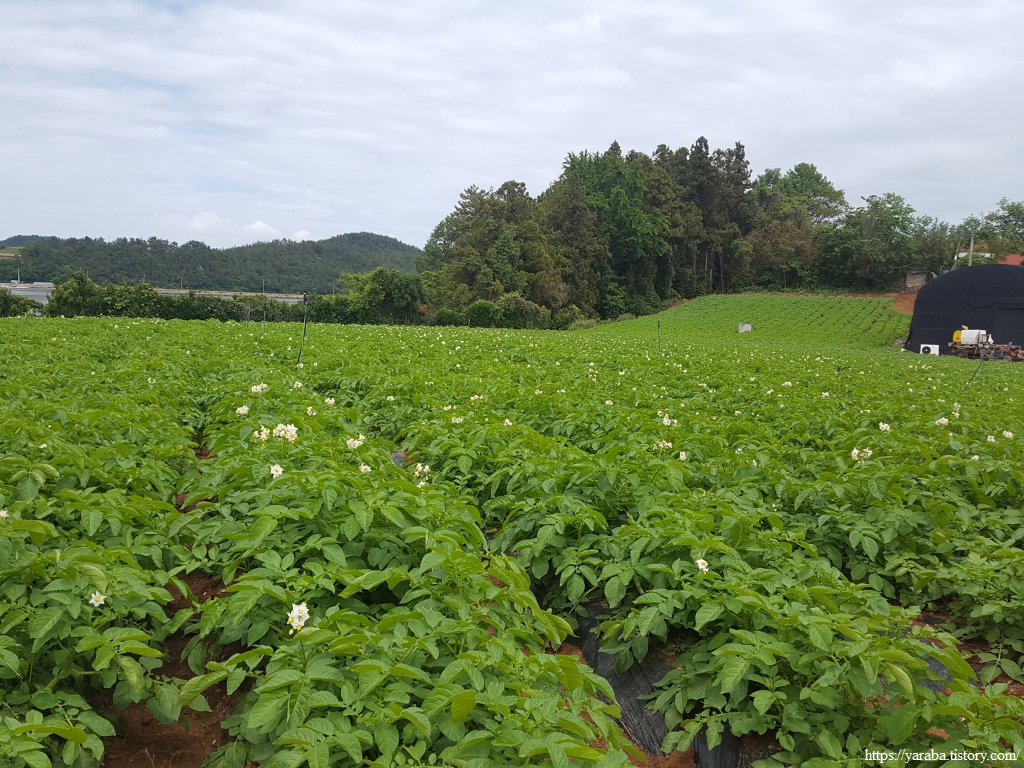 고흥 감자밭에는 감자꽃이 활짝 피었다. 위쪽 지방보다는 확실히 빠르다. 예전에는 감자꽃을 따주어야 감자가 굵어진다는 말이 있었지만 최근의 개량 감자들은 꽃은 피지만 열매가 맺히지 않으므로 꽃을 따주지 않아도 된다고 한다.