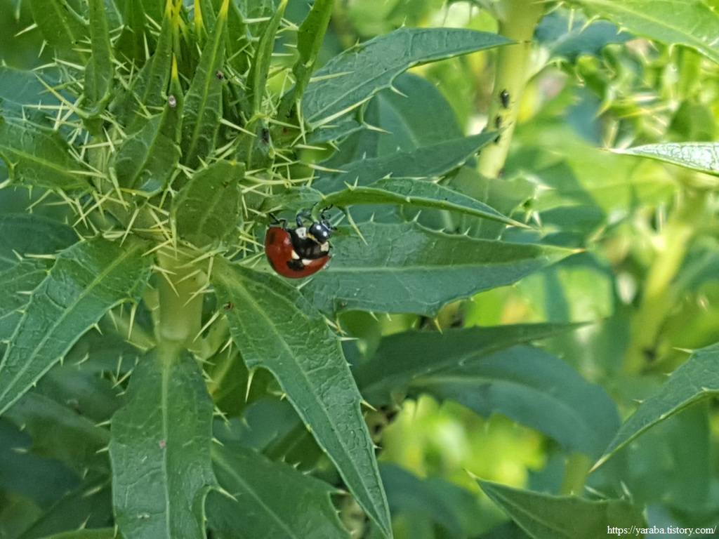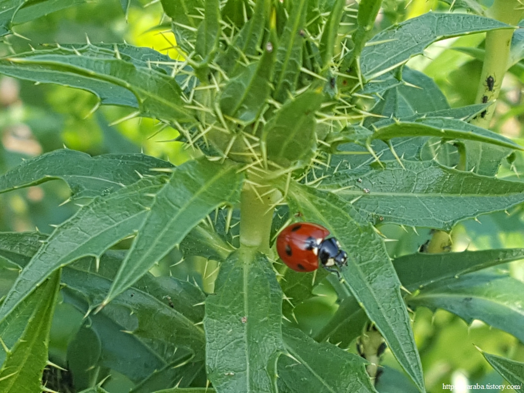 토종 가시 홍화에 칠성무당벌레가 붙었다. 우리 집 매실나무에도 찾아주면 좋으련만 농약 냄새나는 우리 동네에는 오지 못하고 물 좋고 공기 좋은 고흥 땅에 있나 보다. 홍화에도 진딧물이 잘 든다는데 홍화 심은 주인장은 칠성무당벌레 덕에 좋겠다.