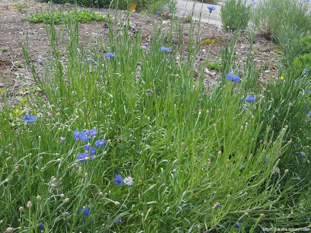 마을 공터에 파란빛의 수레국화가 독특한 자태로 우리의 발걸음을 붙잡는다. 유럽이 원산이고 독일의 국화라고 한다. 수레바퀴 국화라고도 부른다.
