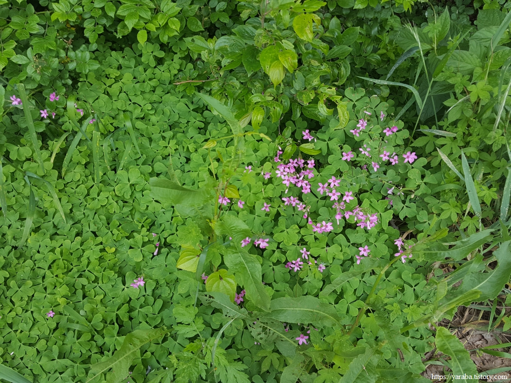 산길로 들어서니 길 초입에서 처음 보는 꽃에 눈길이 간다. 자주괭이밥이라는 북아메리카 원산의 귀화 식물로 관상용으로 키우던 것이 야생화되었다고 한다. 여러해살이풀로 도라지괭이밥이라고도 부른다. 어떻게 고흥 산 아래 구석에 뿌리를 내렸는지 신기할 따름이다.