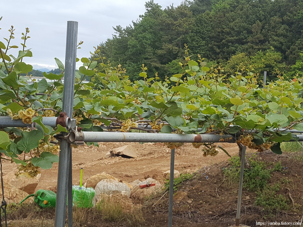 참다래나무가 노란 꽃을 피웠다. 다래 농사도 쉽지 않아서 사과 과수원처럼 꽃 솎기도 해야 하고 튼실한 열매를 위해서는 인공 수분도 해주는데 한 해 전에 수꽃이 열리기 전에 따 모아서 다음 해 인공 수분 때 사용한다고 한다. 꽃가루에 색소와 증류수를 넣어서 분사하는 방식이라고 한다. 색소를 넣으면 수분한 것과 그렇지 않은 것을 구분할 수 있으므로. 덩굴과 큼지막한 잎의 생명력도 매력적이고 열매도 탐스러워 개인적으로 키우고 싶은 나무다.