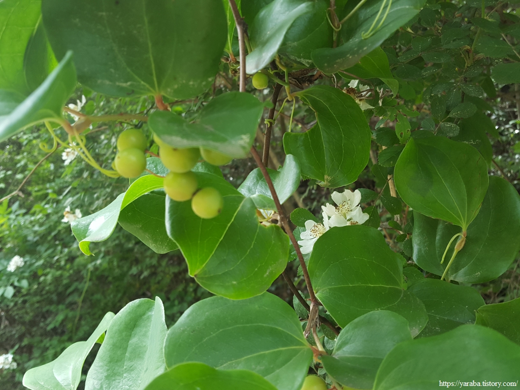 이번에 만난 것은 풀이 아니라 덩굴나무인 청미래덩굴이다. 포도송이 같은 푸른 열매가 맺혔는데 익으면 붉게 변한다. 망개떡이라고 하는 것이 바로 이 청미래덩굴의 잎으로 쌀가루를 싸서 찐 떡을 말하는 것이다. 독특한 향도 베이고 잘 쉬지 않는다고 한다.