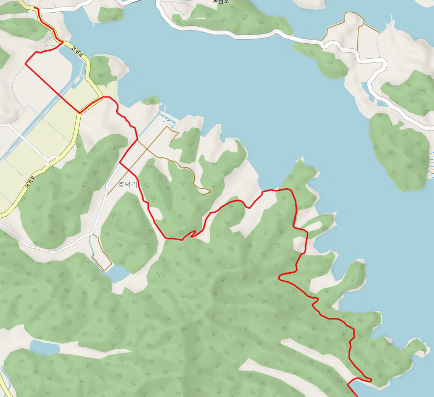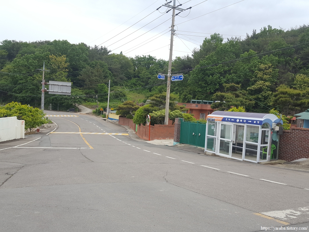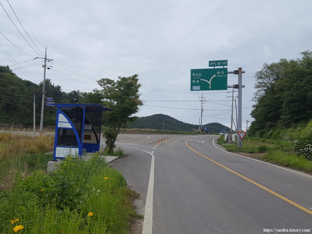 독대 마을에서 쉰 지 얼마 되지 않았는데 화덕 마을 정류장에서 또 엉덩이를 붙이고 잠시 쉬어 간다. 옆지기가 힘들어한다. 길은 화덕 삼거리에서 화덕 방향으로 우회전하여 길을 이어간다. 화덕 마을 앞바다의 백일도를 보면서 화덕 마을로 들어간다.