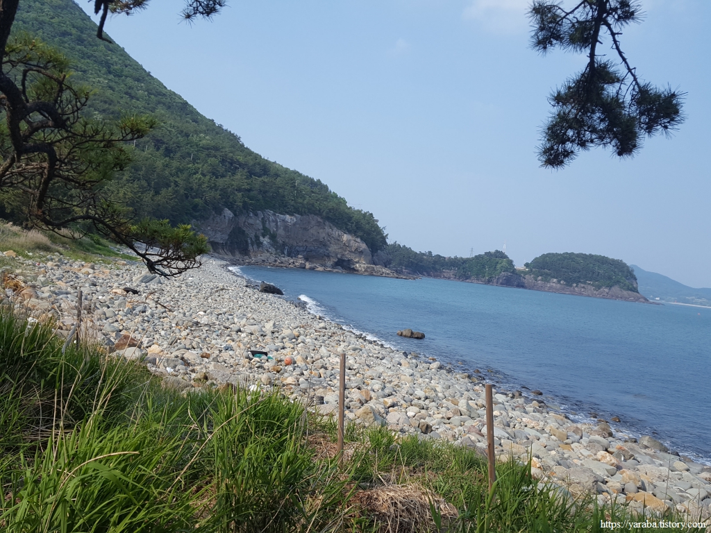 남열 몽돌 해변 끝자락에 도착했다. 활처럼 휘어진 몽돌 해변은 북쪽으로는 영남 용바위가 남쪽으로는 사자바위가 해안을 지키고 있다. 바닷물에 발이라도 담그고 싶지만 아직 갈길이 멀다. 편의 시설이 없는 것이 흠이지만 조용하게 몽돌 해변을 즐기기에는 이곳만 한 곳이 없지 않나 싶다.