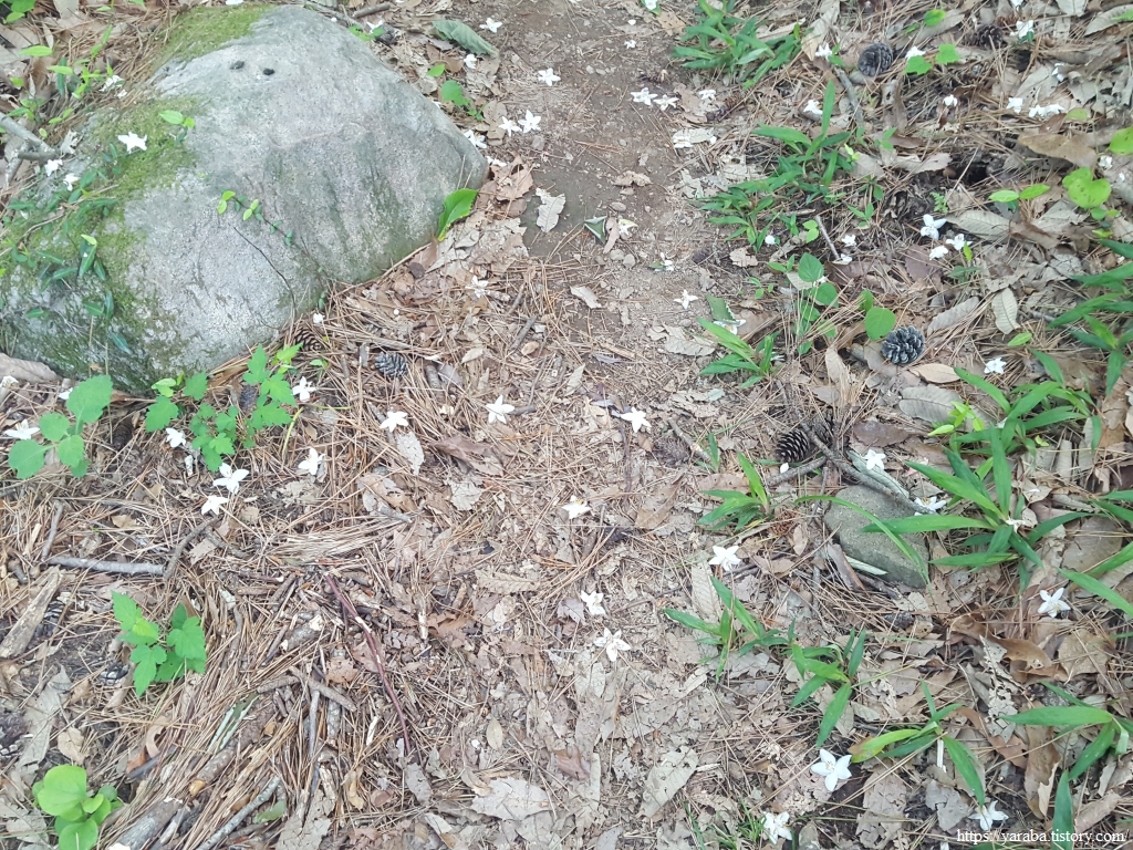 길을 이어가는데 길바닥 하얀 꽃송이들이 떨어져 있고 주위로는 감미로운 향기가 맴돈다. 고개를 들어보니 때죽나무였다. 열매나 줄기를 갈아 물에 풀면 마취 성분 때문에 물고기가 떼로 죽는다는 바로 그 나무다. 나무에 매달린 하얀 꽃들도 예쁘지만 향기도 훌륭하다. 실제로 실험한 보고서를 보면 일정량을 물에 풀면 물고기가 마취되어 활동성이 저하되고 다시 원래의 물로 돌려놓으면 정상화되었다고 한다. 활어등을 운반하는 과정 등에서 물고기들의 스트레스를 줄이는 등에 사용할 수 있다고 한다.