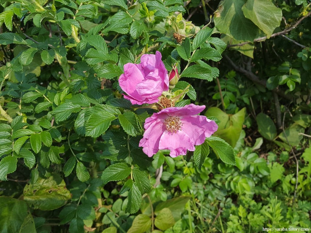 길가에 심은 해당화가 활짝 꽃을 피웠다. 어떤 꽃은 활짝 피어 있고, 어떤 것은 열매가 맺혀 있고, 어떤 꽃은 꽃봉오리가 터지기 직전이다. 5월에서 7월까지 꽃을 피우니 벚꽃처럼 잠깐 피었다가 사그라드는 꽃은 아니다.