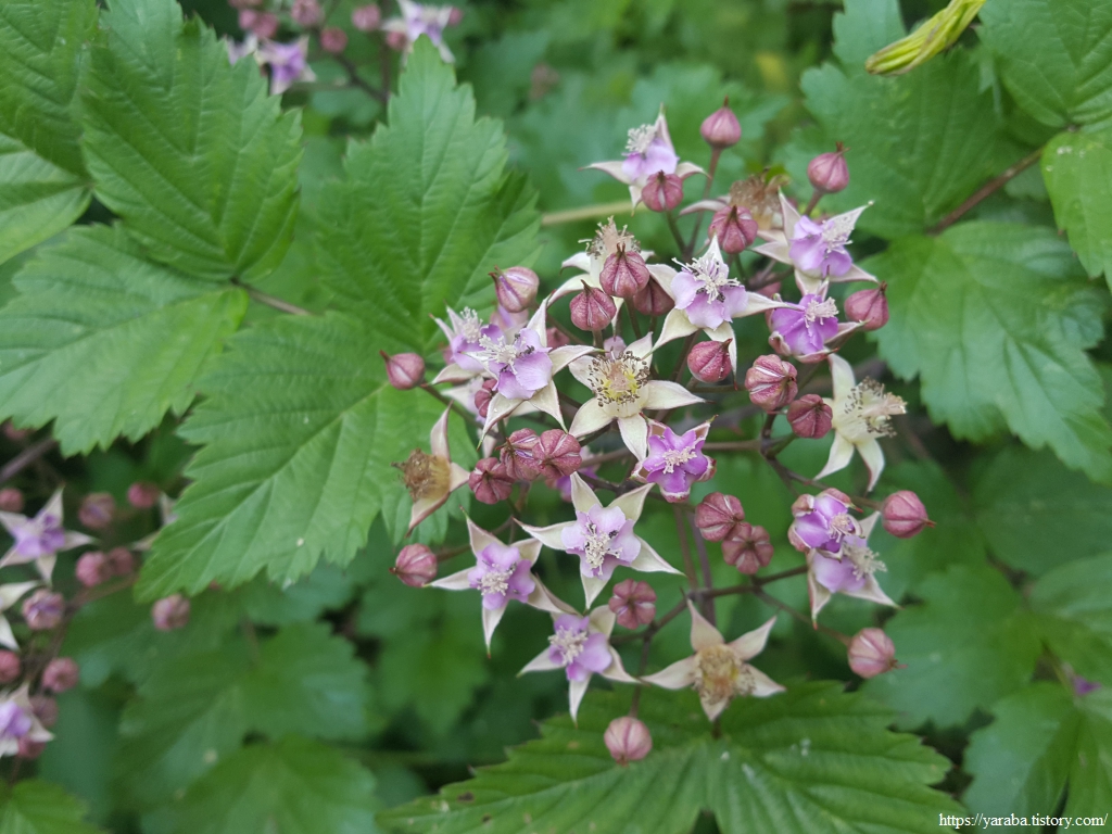 길가에 복분자딸기가 꽃을 피웠다. 보랏빛이 도는 꽃이 나름 매력이 있다.