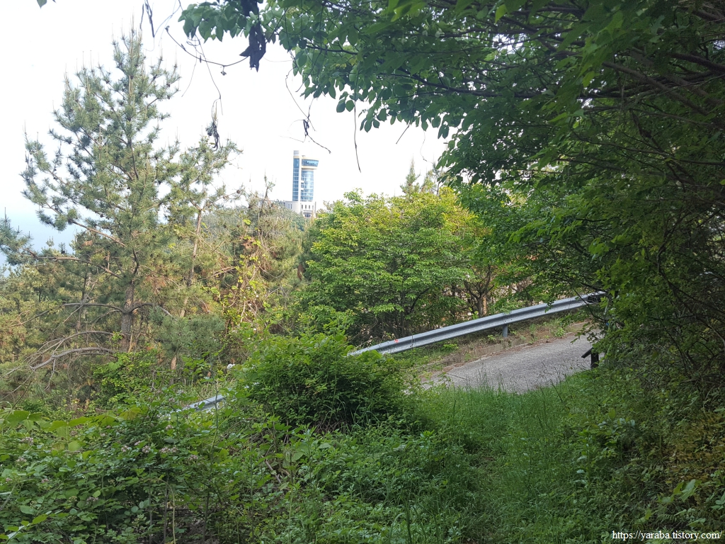 얼마나 내려왔을까? 나무 사이로 산 아래 도로도 보이고 산 너머의 우주 발사대 전망대도 보이기 시작한다.
