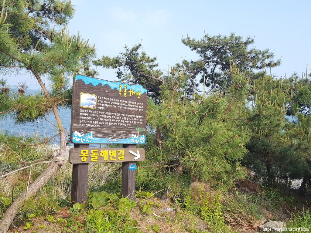 몽돌해변길 안내판. 300미터에 이르는 몽돌 해변을 보고 싶다면 다른 사람들처럼 해변에 있던 카페에서 바로 해변으로 내려가면 되지만 해변을 지나 전망대로 올라가야 하는 우리는 농로를 따라 해변 끝자락으로 걷는다.