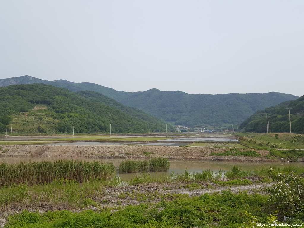 길은 양사방조제의 둑방길을 걸어 서쪽으로 향한다. 방조제 위에서 북쪽으로 예전에는 갯벌이었을 평야를 바라본다. 모내기가 한창이다.