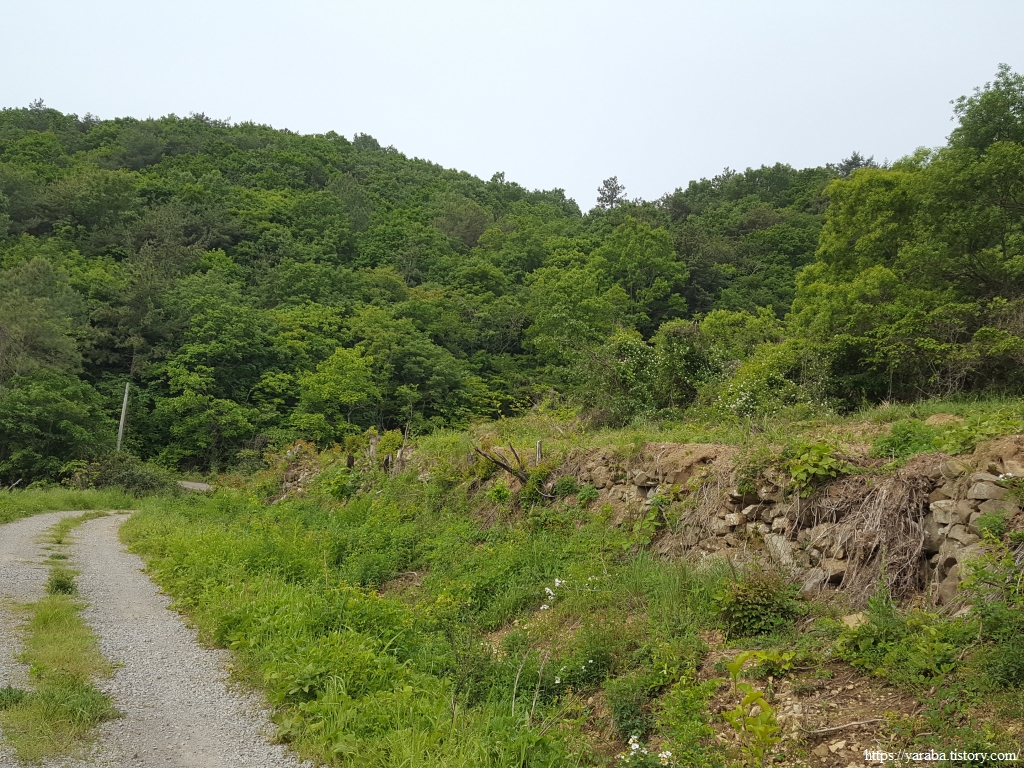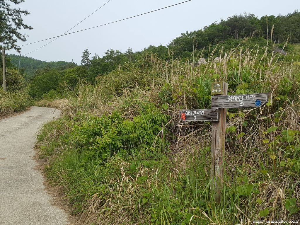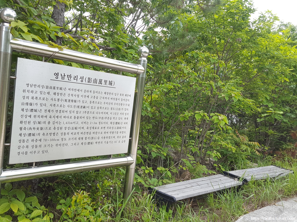 영남만리성이라는 안내판은 있지만 나무숲 때문에 실제 그 흔적은 거의 볼 수 없다. 포털의 위성사진을 보면 그 흔적을 조금 확인할 수 있는데, 지금 걷고 있는 해안길이 성을 가로질러 넘어가고 있는 형태이다. 성을 넘어가는 지점에 안내판이 서 있는 것이다. 전해지는 이야기는 해창만 간척 공사때 만리성의 돌들을 뜯어다가 사용했다고 한다. 역사 보다는 눈앞의 먹고 사는 일에만 매몰되었던 우리네 지난날의 흔적이다.