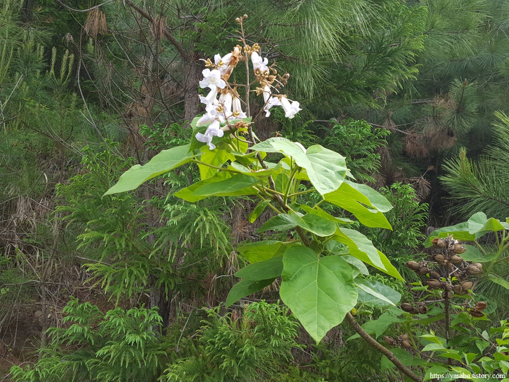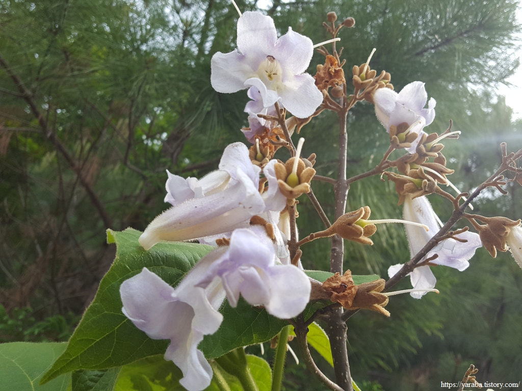 오동나무 꽃을 만났다. 오동나무는 잎도 꽃도 독특하다.