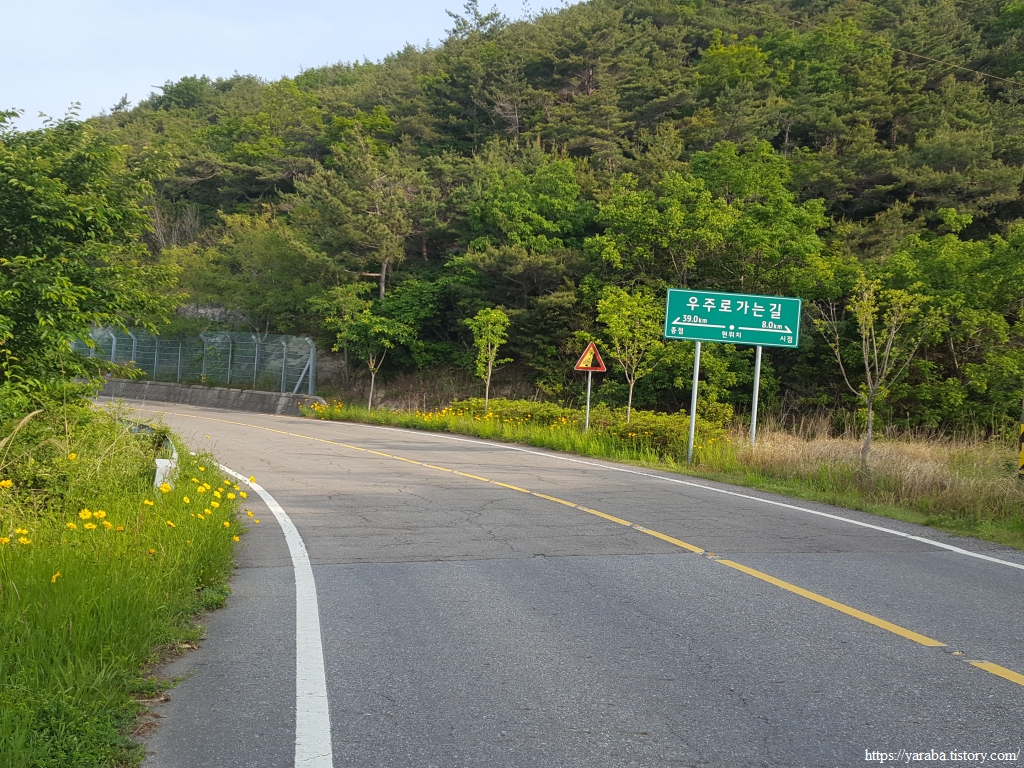 이른 아침의 고용한 바다를 감상하며 걷는 길, "우주로 가는 길"이라는 표지판이 등장했다. 봉래면 외나로도의 우주센터까지 47Km에 이르는 길이다.