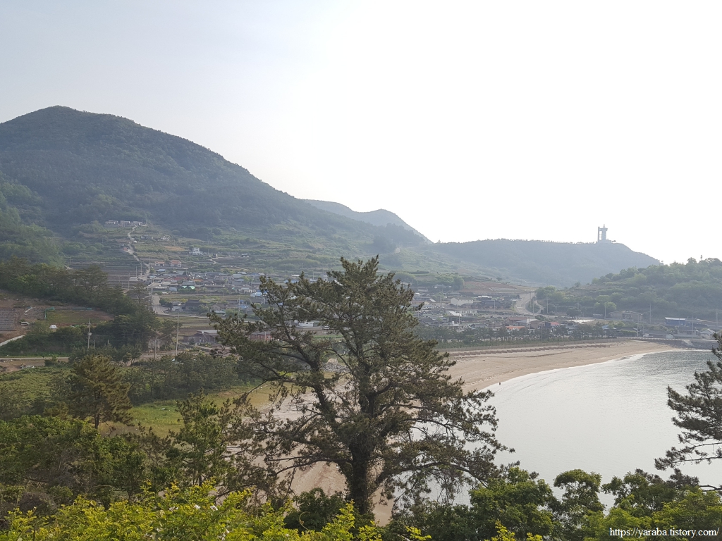 오르막길을 좀 더 오르니 멀리 우주 발사대 전망대와 우미산 정상도 들어오고 남열 마을의 모래해변도 눈에 들어온다. 어제 묵었던 펜션은 저 해변의 중앙에 홀로 있었으니 저 해변을 전용 해수욕장처럼 누릴 수 있었던 것이다. 전화 예약만 가능한 것이 흠이지만 아이들이 있는 집이라면 놀기 정말 좋은 곳이었다.