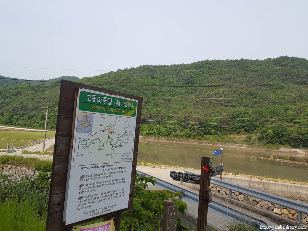 고개를 내려가서 멀리 보이는 팔영산 아랫 자락의 읍내로 가면 영남면 사무소도 만나고 남포미술관 인근에서 팔영산을 오르는 등산로도 만날 수 있다. 남파랑길은 고흥 마중길 제1 코스와 함께 하천을 건너서 반대 방향으로 양사 방조제 방향으로 이동한다.