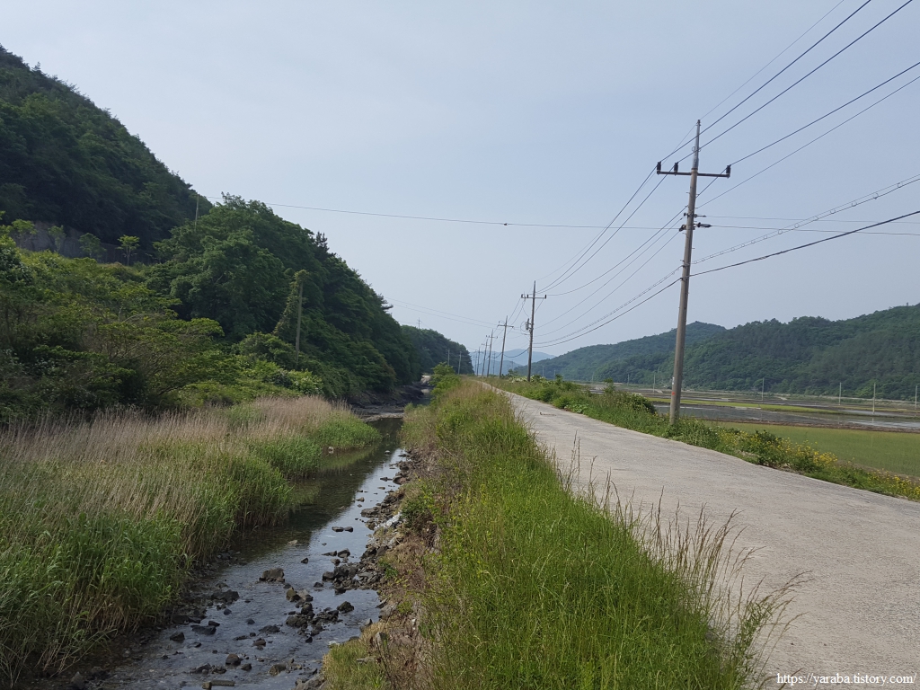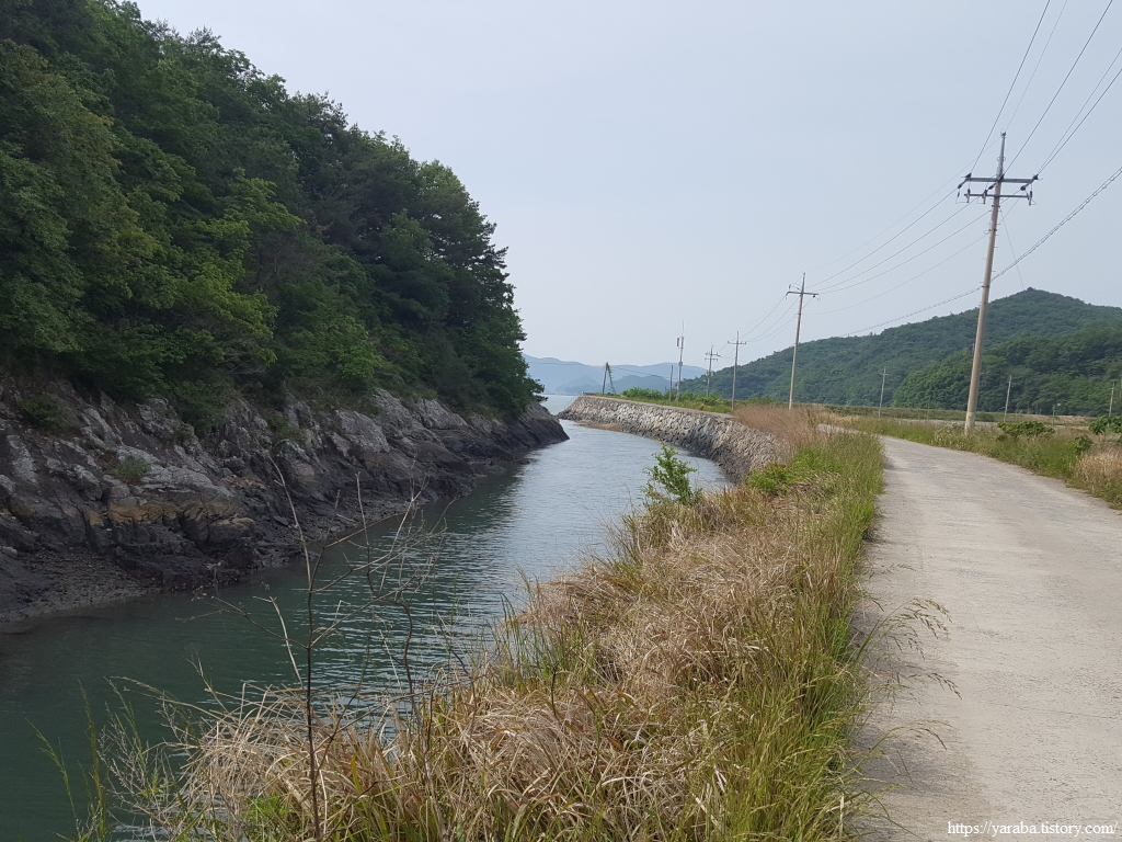 양사 방조제를 향해 내려가는 길의 좌측은 좁은 수로이지만 민물과 바닷물이 만나는 깨끗한 하천이었다.