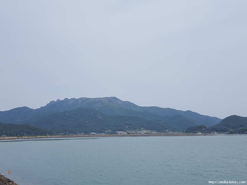 오도로 들아가는 입구에서 바라본 팔영산 풍경도 훌륭하다. 바로 앞으로는 오도 해안선, 바다 건너 우측으로는 사도 마을, 중앙에 능정 마을 좌측의 배수 갑문까지 방조제 앞바다가 작은 호수와 같은 그림이다.