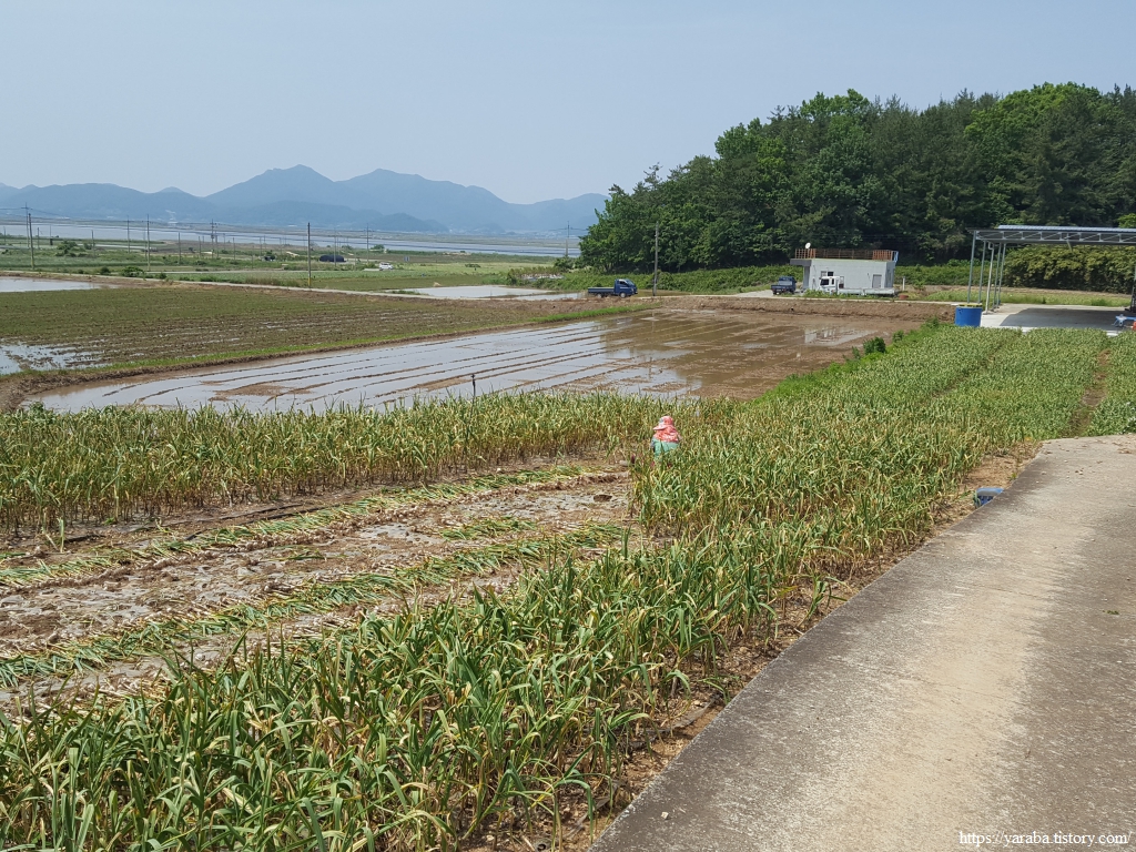 5월 중순인데 이곳은 벌써 마늘을 캐서 말리고 있다. 토실토실한 마늘을 보면서 내것은 아니지만 와 좋다! 를 연발한다. 지난가을에 심어서 겨울을 잘 이겨낸 한 해 첫 수확이나 마찬가지인 농작물이 마늘이다. 농촌에 살다 보면 대부분 자신이 먹을 마늘은 키우기 마련인데 남의 떡이 커 보인다고, 할머니들은 이 집 저 집 다니며 이 집 마늘 좋네! 어디는 무슨 비료를 주었다는데...... 하는 설레발을 치시기도 한다. 멀리 마을 쉼터가 보인다.