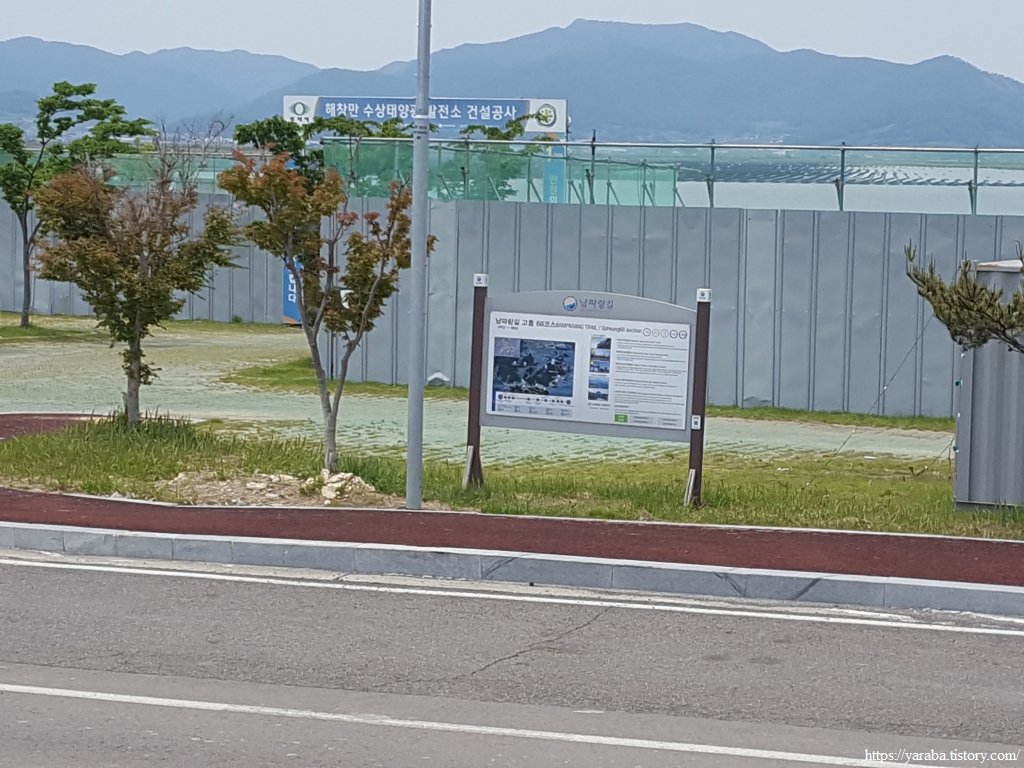 남파랑길 68코스 안내판 너머로는 방조제가 만든 담수호에 국내 최대 규모의 해창만 수상 태양광 발전소가 건설 중이었다. 주민 참여형으로 상업 발전을 시작하면 수익이 조합을 통해 주민들에게 배분되는 방식이라고 한다. 우리가 방문할 당시에는 준공 직전이었다. 여러 논란 가운데 지속 가능한 사업이 될지 모르겠다.