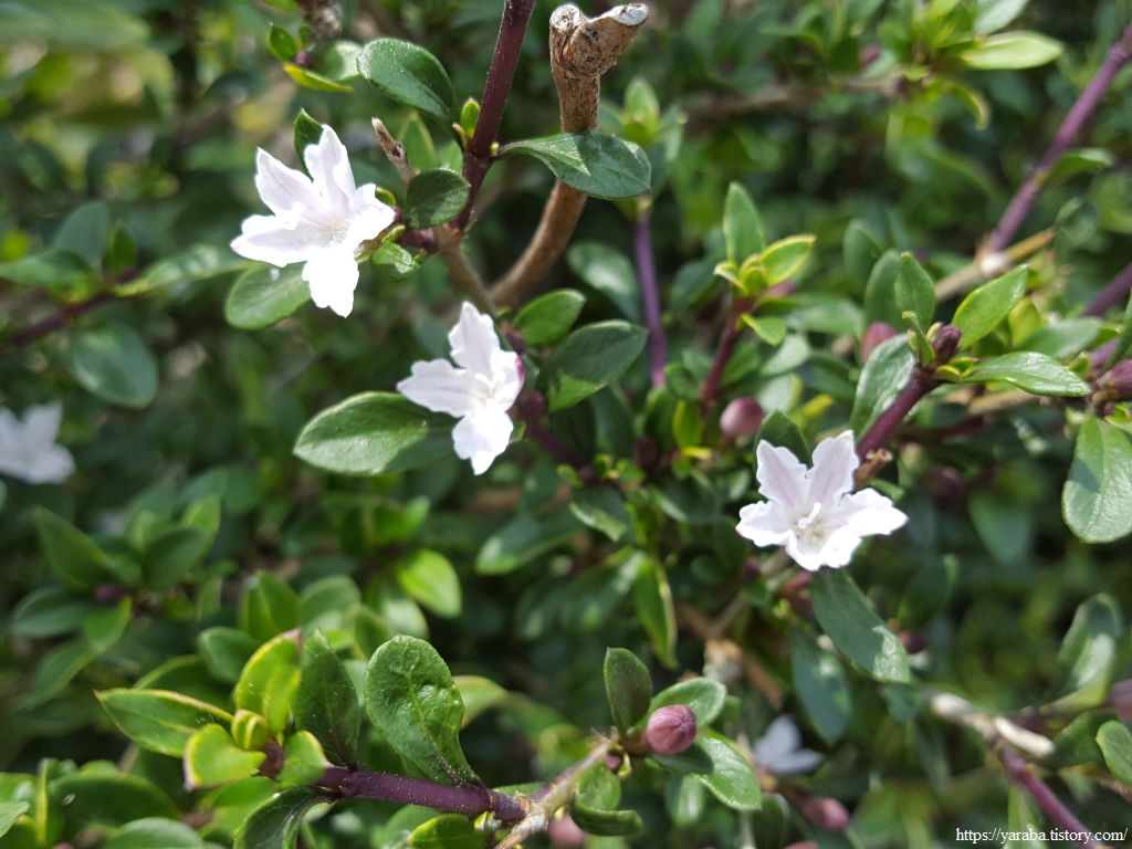 언덕을 넘는 길에서 특이한 꽃을 만났다. 하얀 꽃잎도 나뭇잎도 범상치 않은 모양을 가진 백정꽃이라고도 부르는 백정화다. 중국 남부지방이 원산이며 그림처럼 울타리 나무로 심거나 관상용으로 심는다고 한다.