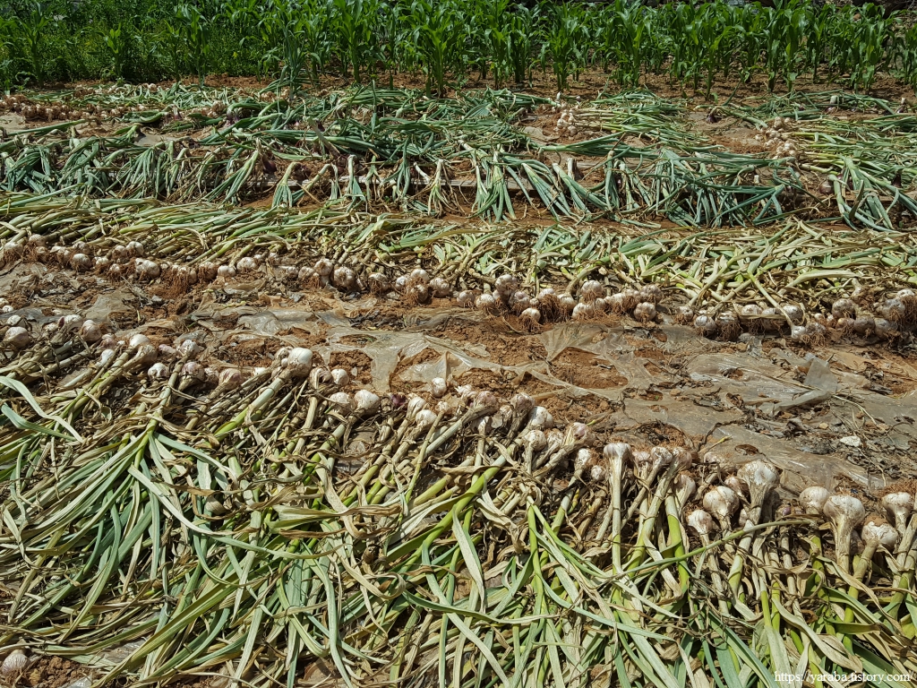 강렬한 태양 아래서 식물을 저렇게 두면 식물을 죽이는 것 같지만 생명이란 신비로워서 영양분은 뿌리로 내려오고 다음 세대를 이어갈 준비를 한다. 마늘이 굵고 좋다.