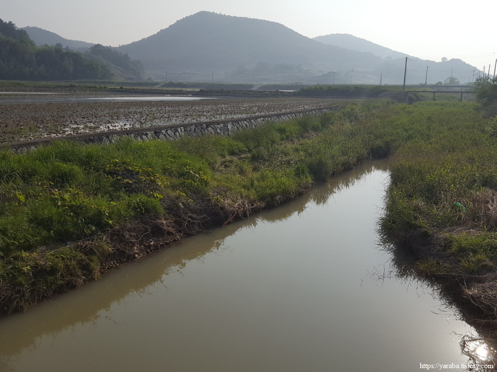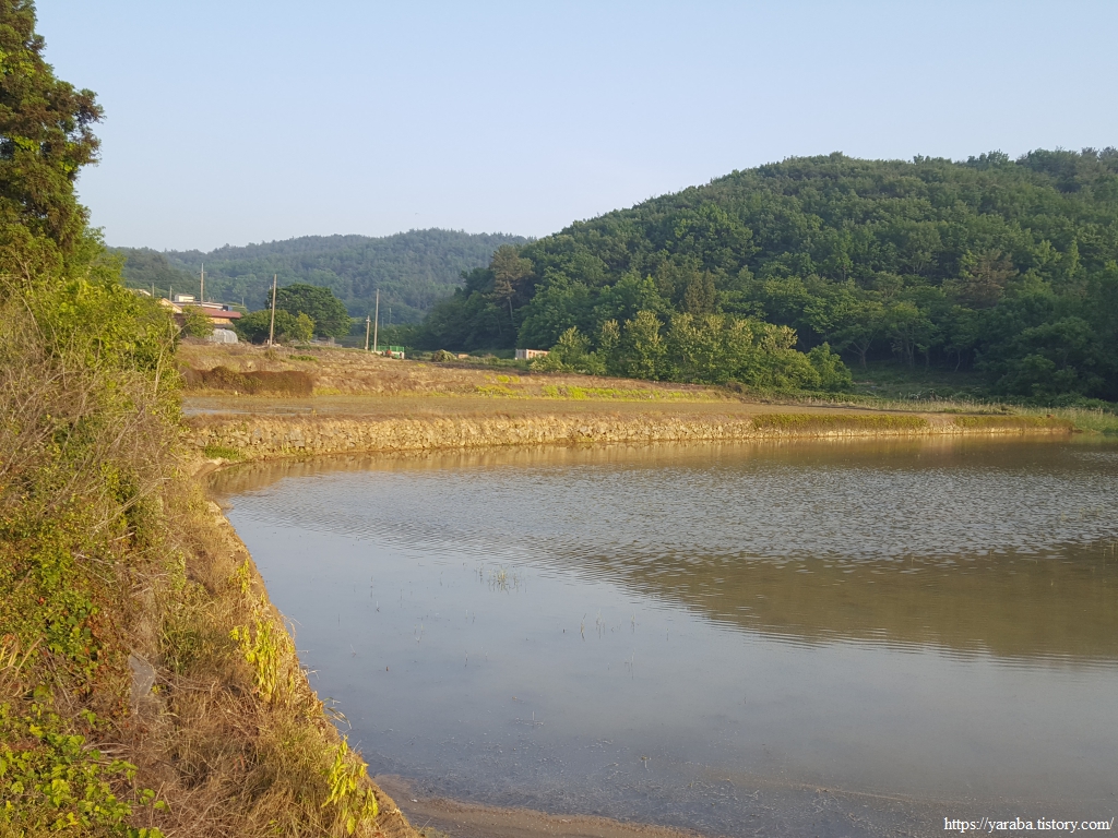 중산 마을을 벗어나 다시 농로를 걷는다. 한창 모내기를 준비하고 있는 논을 보니 돌을 쌓아 만든 논이다. 한 뼘의 땅이라도 더 이용하려는 선조들의 피와 땀이 어려있는 곳이다.