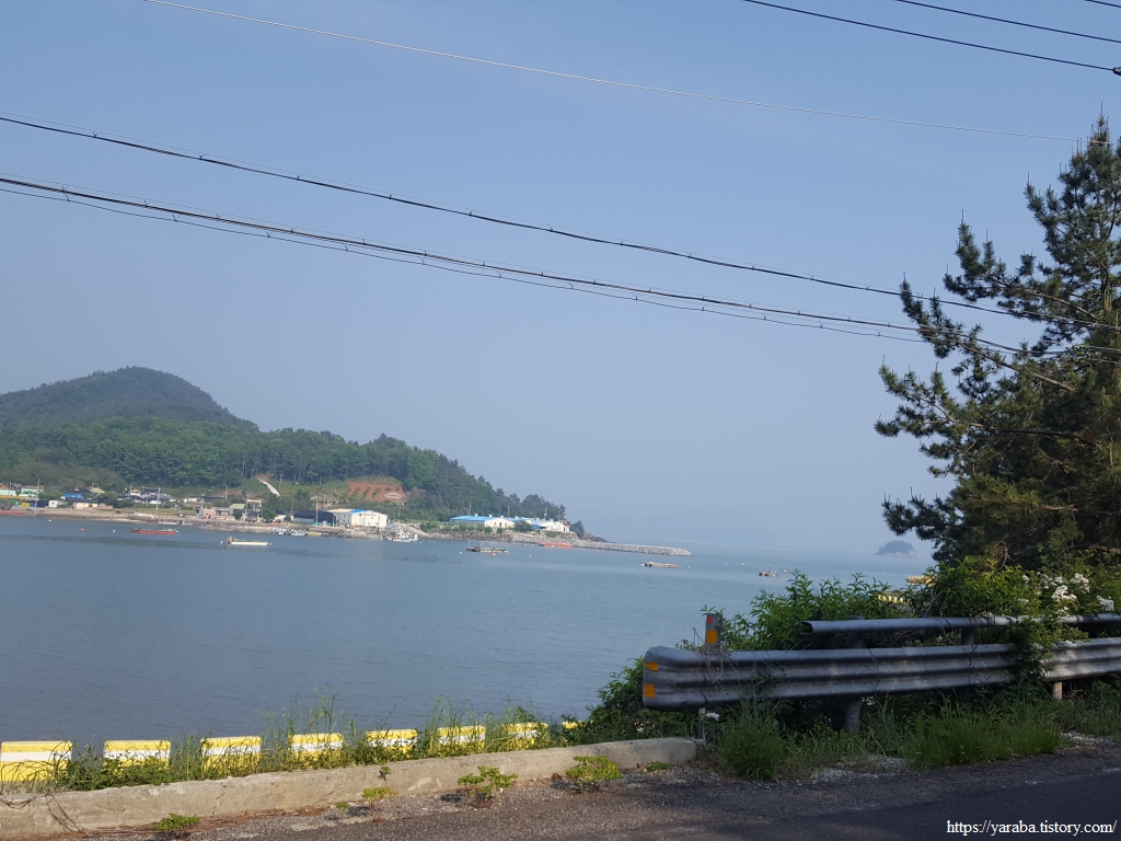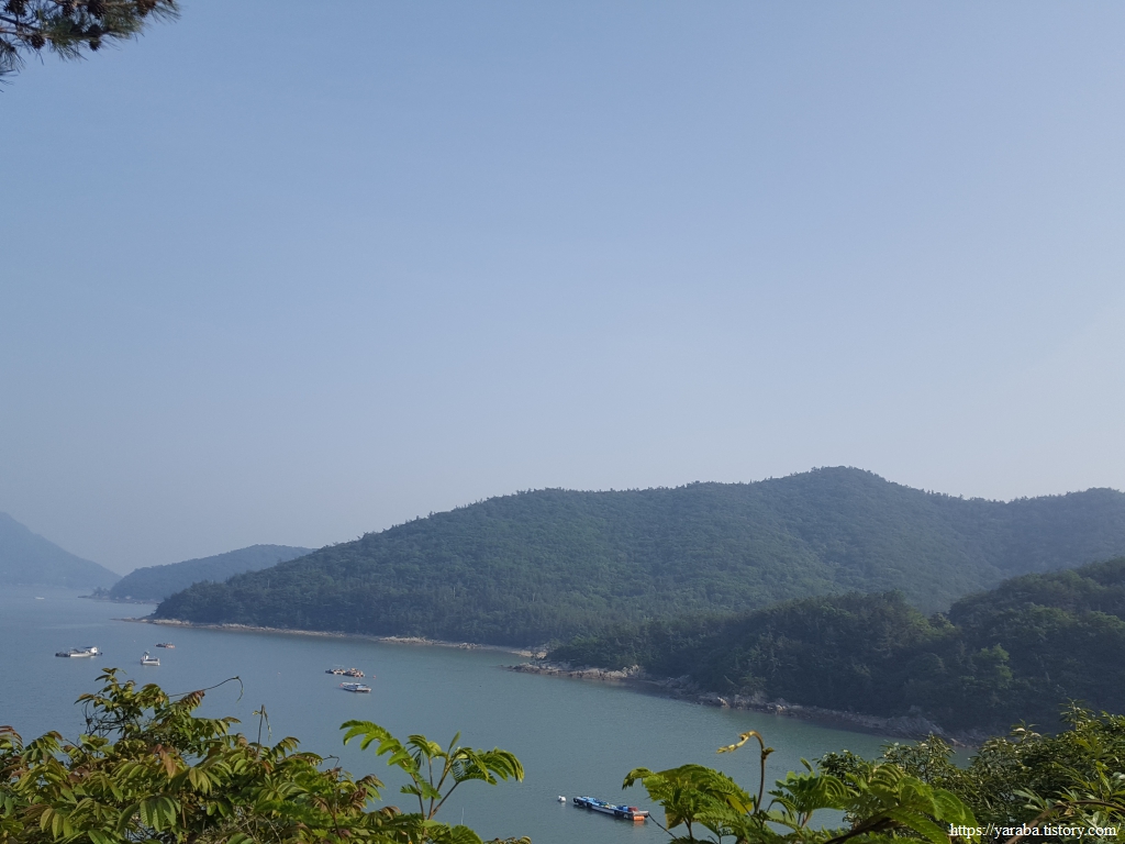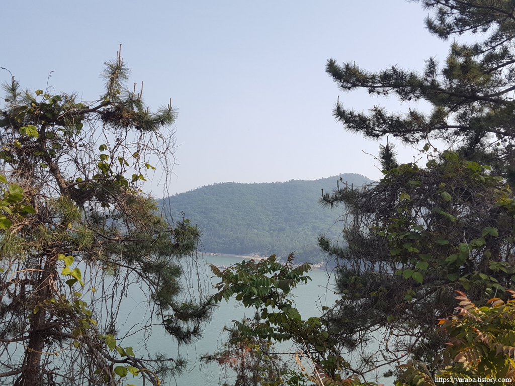 국도 쪽으로 이동하는 길, 나무로 막힌 해안에서 잠시 열린 시야 속에서 익금 마을 앞바다로 오 형제도, 수락도 등이 보인다. 이 섬들은 다도해 해상국립공원에 속한 섬들이다.
