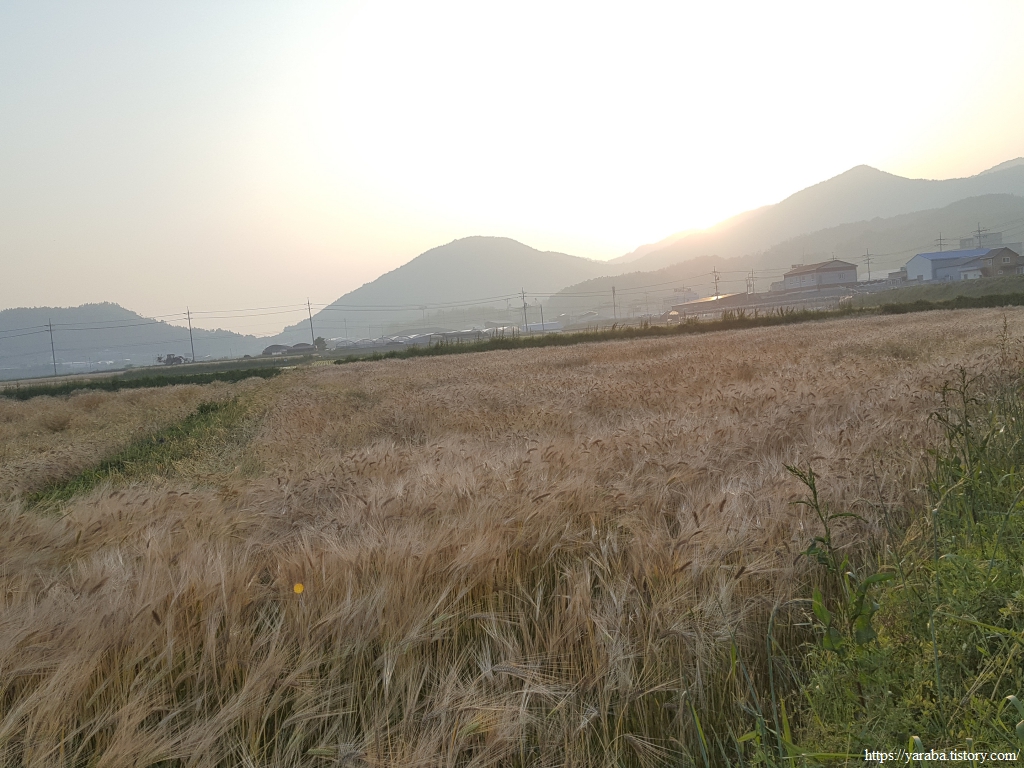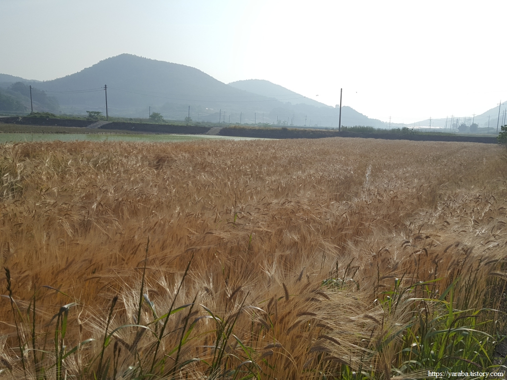 들판에서는 보리가 익으며 황금빛 물결을 만들고 있고 바로 옆 논은 모내기가 끝나서 어린 모들이 자리를 잡고 있다.