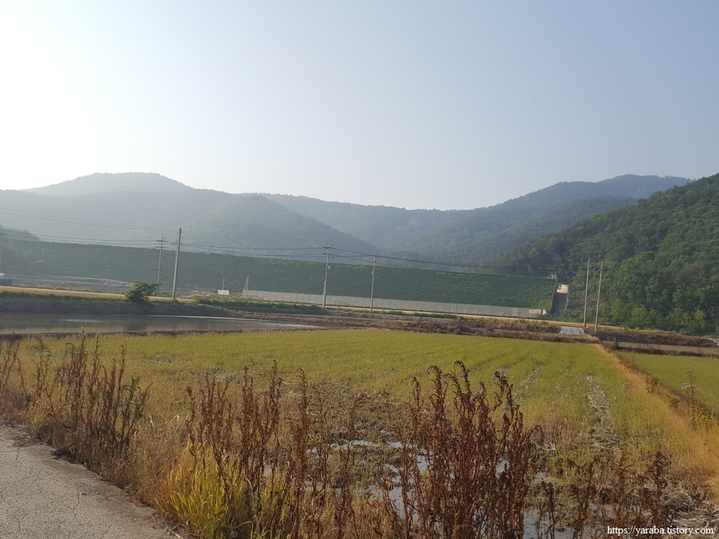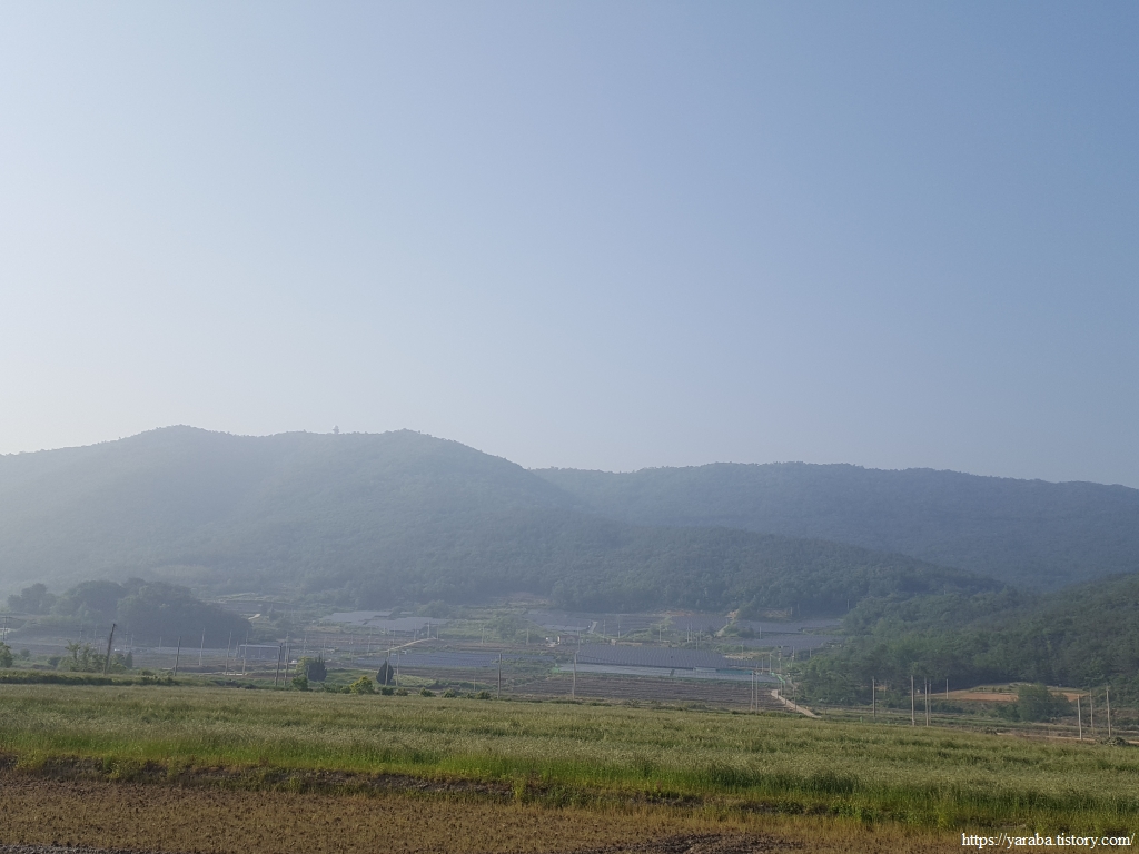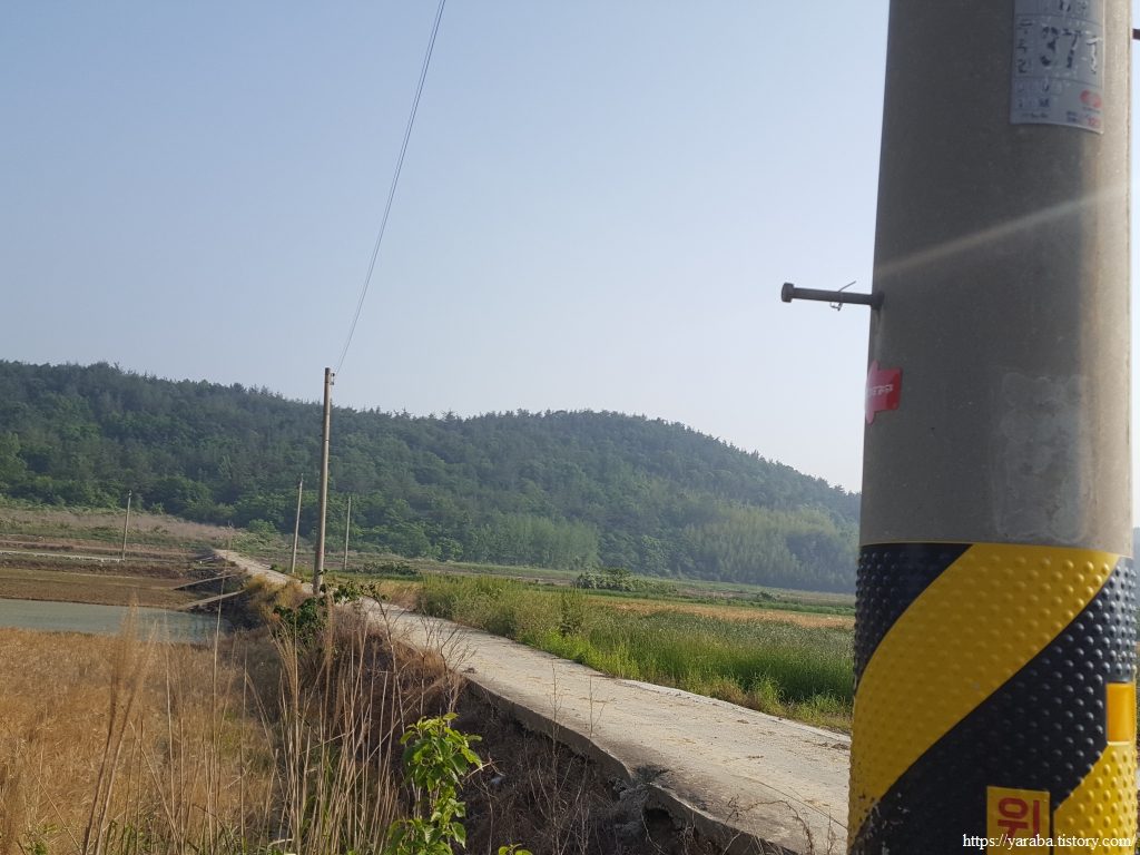 산 아랫 자락을 따라가는 농로에서 바라본 들판 건너편 풍경은 오늘 68코스 여정을 함께 했던 마북산 자락이다. 마북산은 ㄴ자를 옆으로 뒤집어 놓은 형태로 그 서쪽 끝은 오늘의 목적지인 도화까지 이어진다. 산 꼭대기에는 우주센터에 기상 정보를 제공하는 기상관측소도 보인다. 산 중턱으로는 엄청난 태양광 단지가 자리를 잡았다. 남향이니 입지는 좋아 보인다.