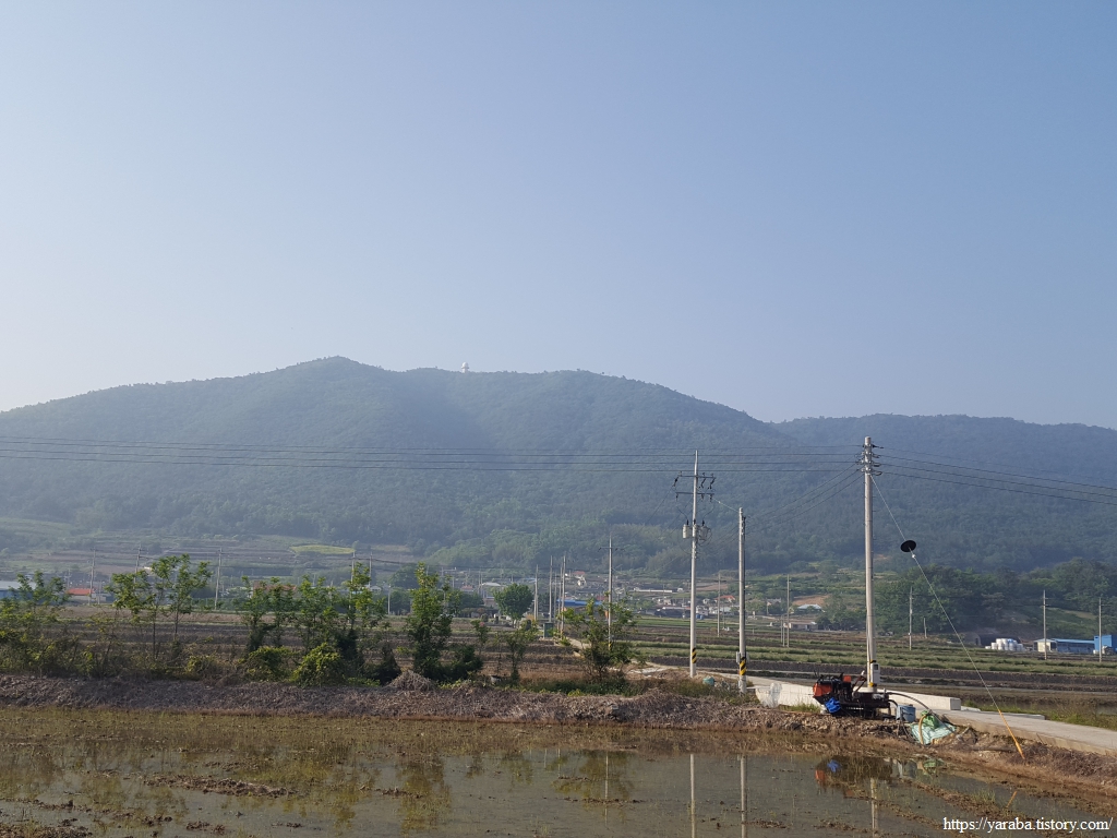 모내기가 한창인 들판 너머로 기상관측소 아래로는 봉산 마을이 자리하고 있다.