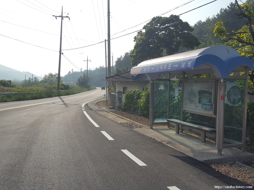 석수포 삼거리에서 우회전하여 봉산로 도로를 따라 서쪽으로 이동한다. 우리는 석수포 버스 정류장에서 잠시 배낭을 내려놓고 쉬었다 가기로 한다. 정류장 바로 뒤로 주택이 하나 있었는데 할머니 두 분이 우리를 보시며, 뭐 하는 사람들인가! 하는 눈빛이시다.