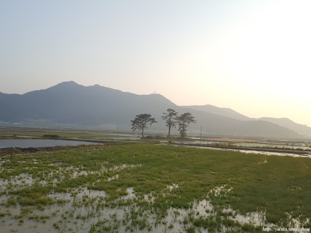 논 한가운데 섬처럼 서 있는 소나무도, 추수를 기다리고 있는 보리들도 서산에 지는 태양에 아름답게 빛난다.