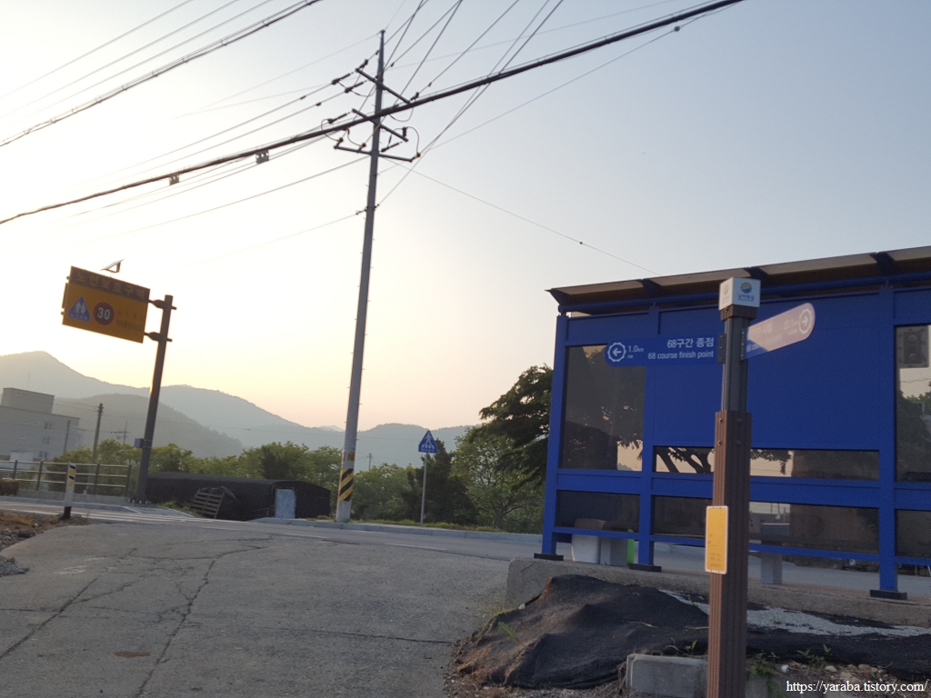 봉산로 도로를 쭉 따라가도 68코스의 종점에 닿지만 남파랑길은 봉산로를 6백여 미터 따라가다가 좌회전하여 농로를 통해서 도화에 이른다. 오후 5시를 바라보는 시각, 서산으로 지고 있는 석양이 눈 부시다.