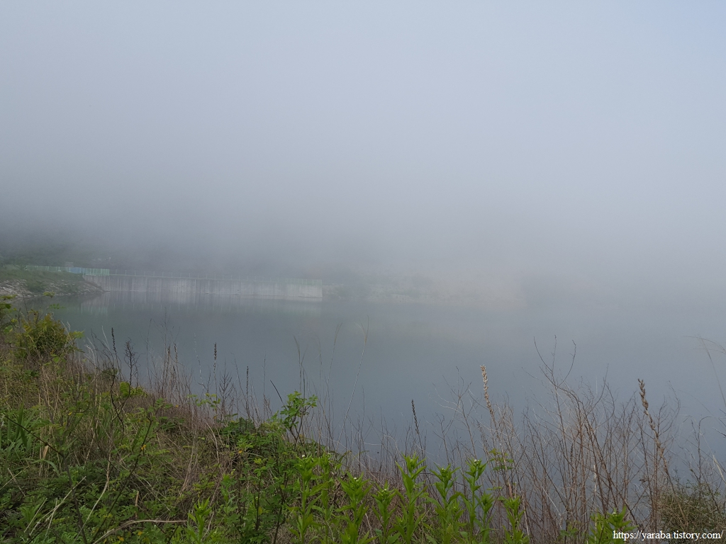 가파른 오르막을 오르며 길 옆을 보면 뿌연 해무사이로 저수지 둑이 겨우 보이는 절벽길이다.