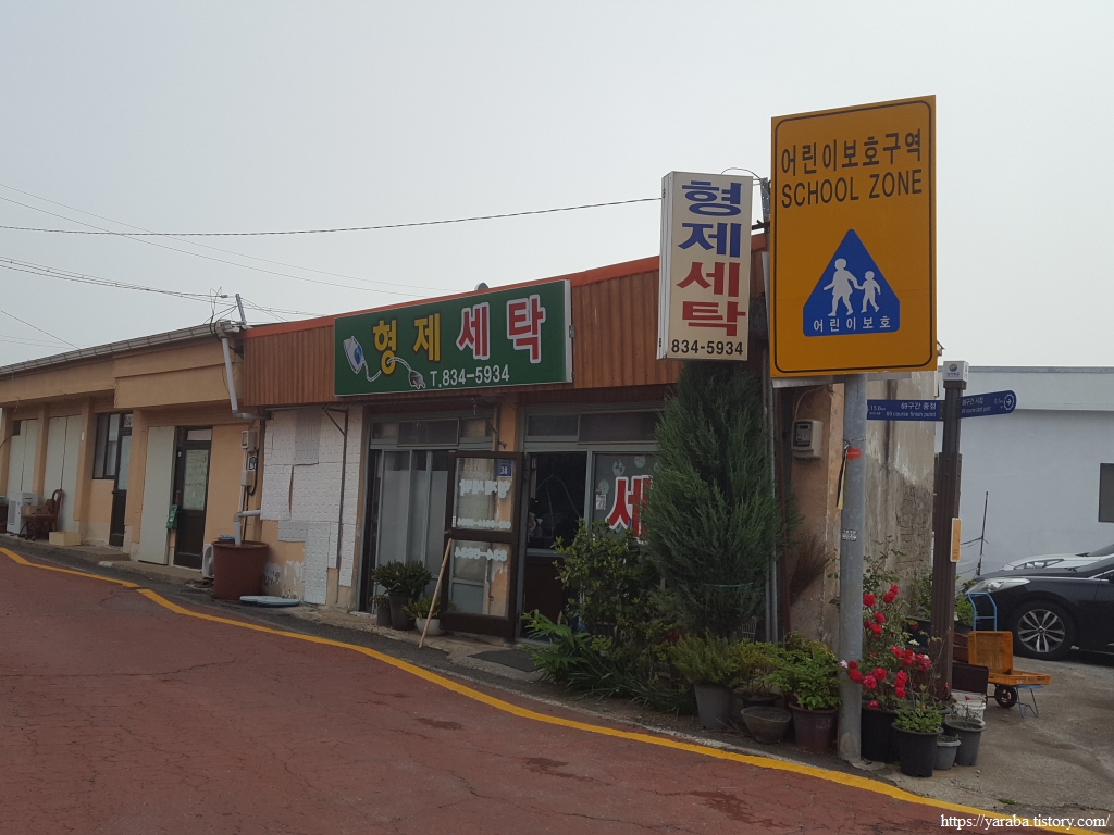 길은 도화 초등학교 방면으로 좌회전하여 어린이 보호구역이 그려진 길을 따라간다.