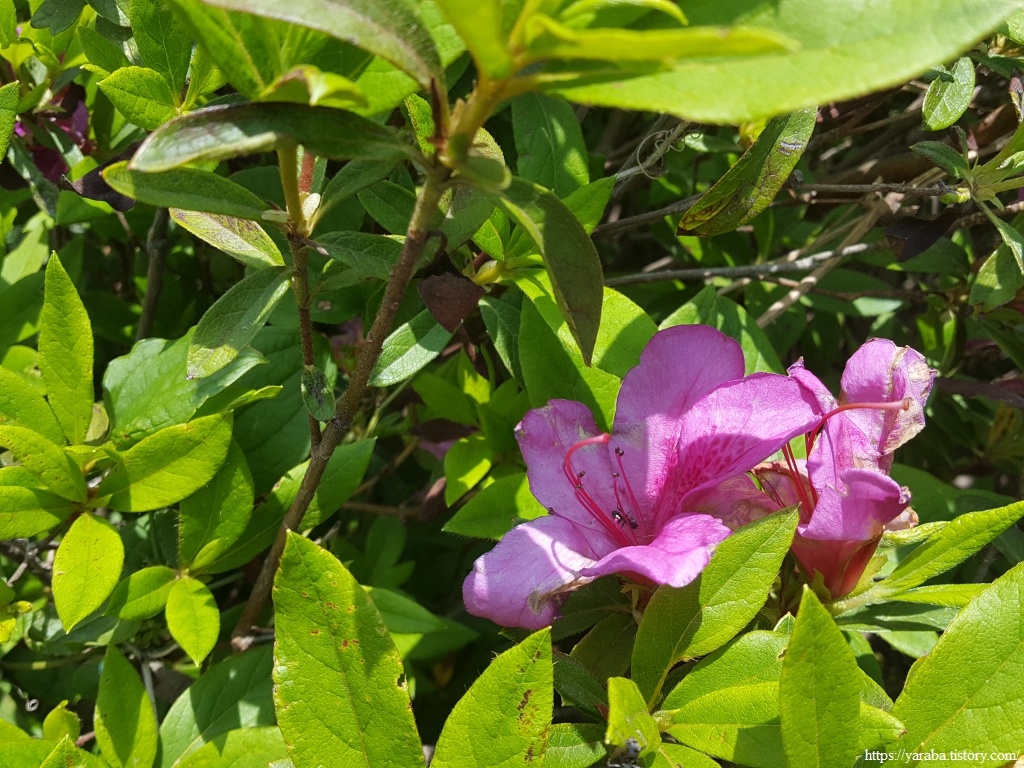 철쭉 공원 표지 뒤쪽으로 가니 남향이 아닌 곳에는 지각생 철쭉을 몇 송이 볼 수 있었다. 쉼터에서 잠시 쉬어간다.