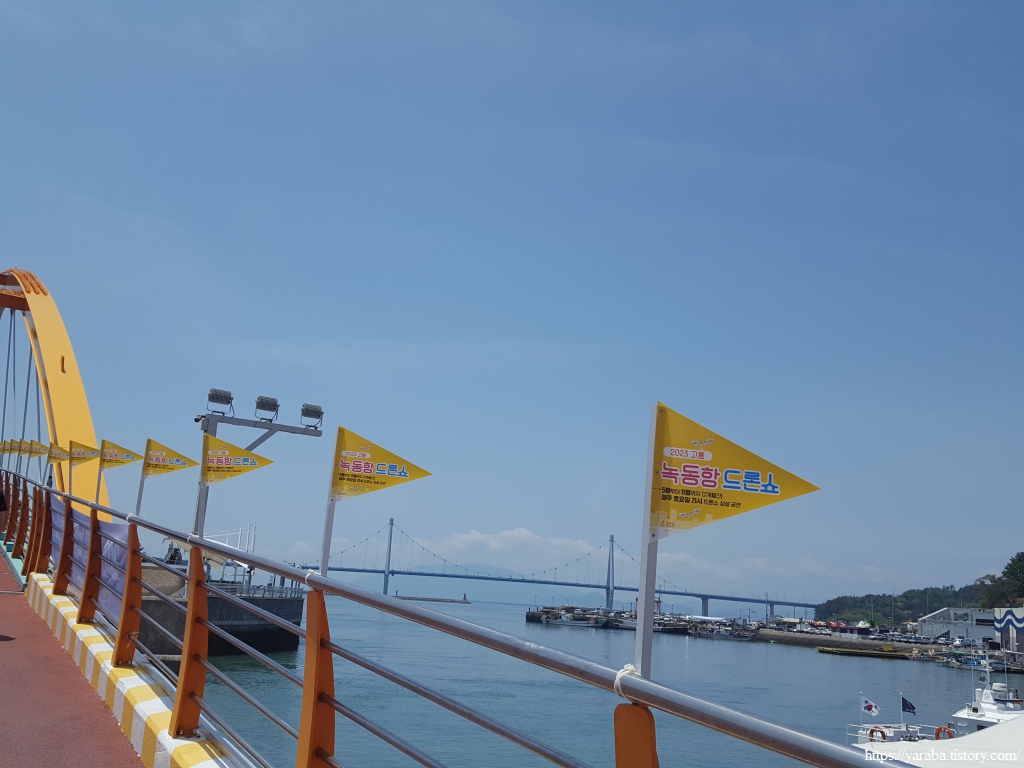 지름이 80미터에 이르는 인공섬인 녹동 바다 정원으로 건너가며 주위 풍경을 돌아본다. 11월까지 매주 토요일 저녁 9시에 드론쇼가 열린다고 한다. 녹동 구항에는 어선들이 빼곡하게 정박해 있다.