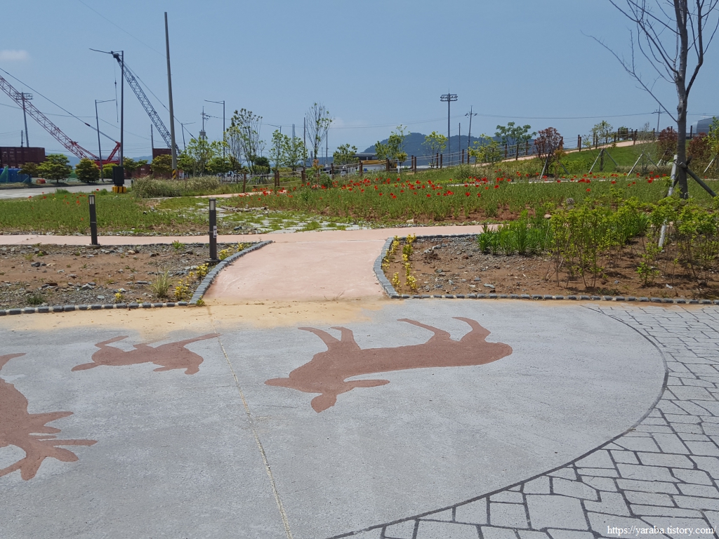 녹동 신항의 항만 도로의 인도를 따라 서쪽으로 이동하다 보면 녹동 파출소 옆 공터에 공원이 마련되어 있었다. 그늘 하나 없는 공원이었지만 오마간척한센인추모공원 이후로 쉬지를 못해서 잠시 쉬어 가기로 했다. 섬의 모양이 작은 사슴 같이 생겨서 소록도라는 이름을 붙였다는데, 그 소록도를 바라볼 수 있는 곳이니 바닥에 사슴을 새겨 놓은 모양이었다.