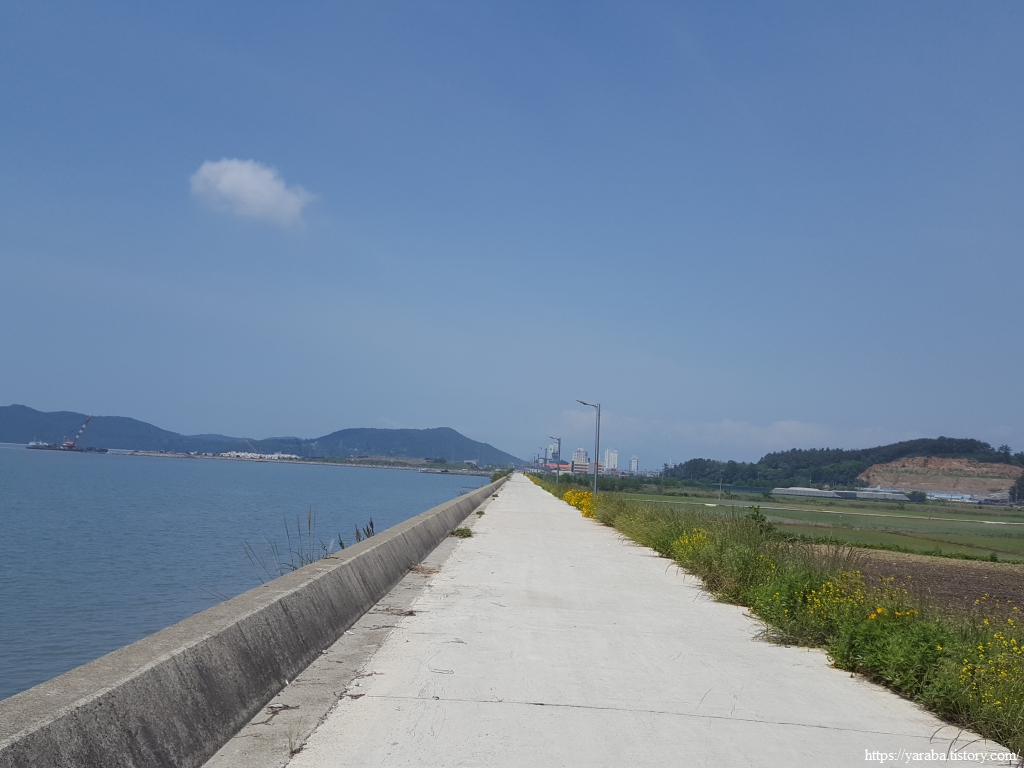 동봉 마을을 떠난 길은 해안 방조제 길로 들어설 때까지 해안 도로를 따라서 걷는다. 정오의 태양이 작렬하는 해변길이다.