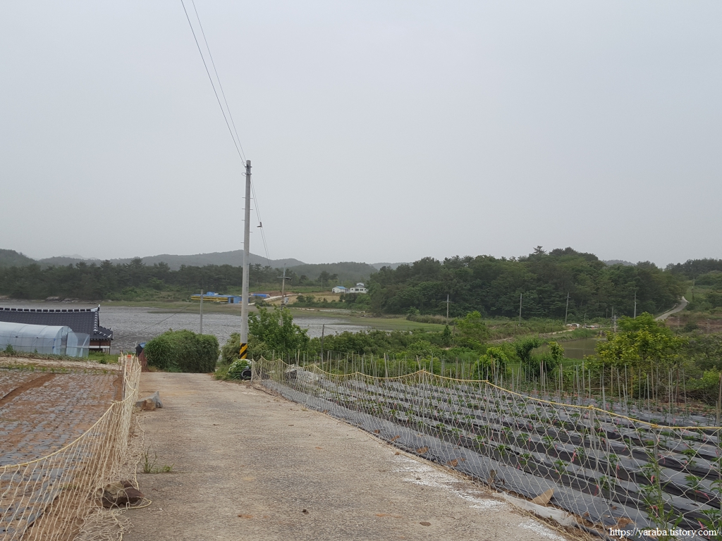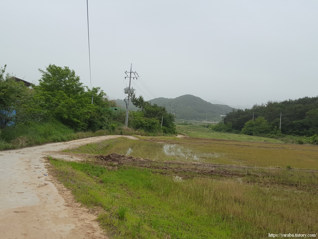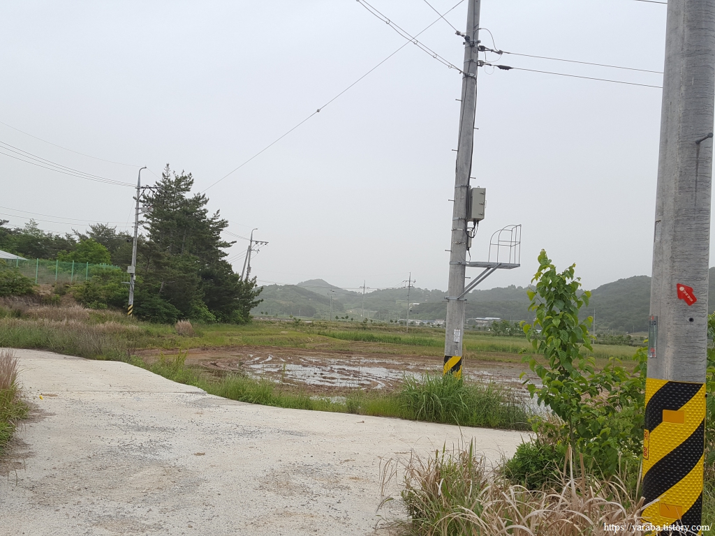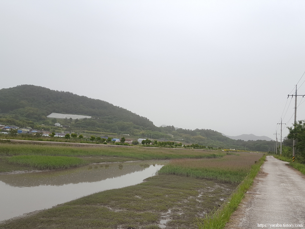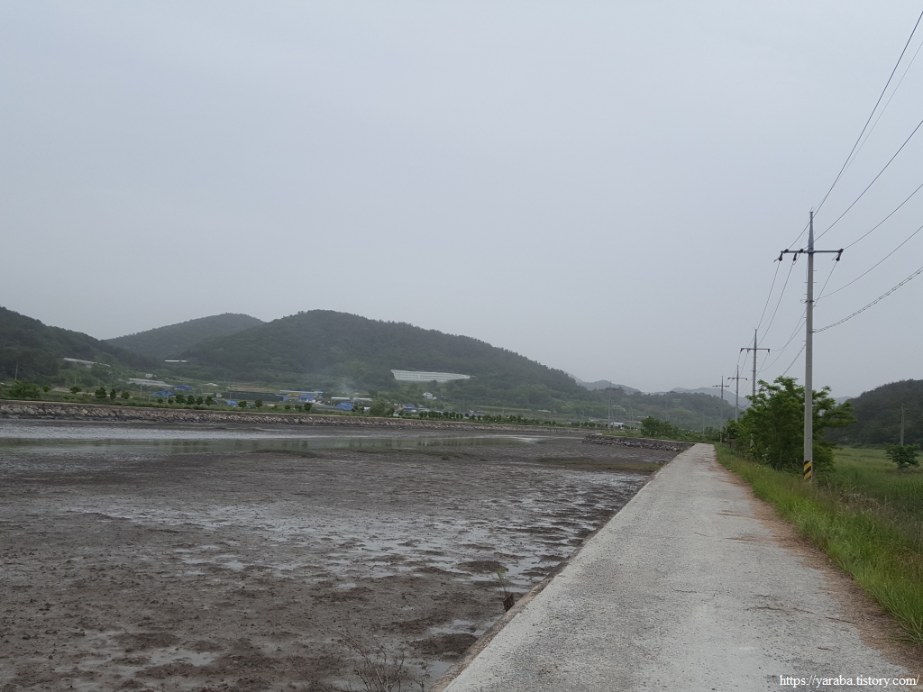예회 마을을 지나 언안산을 넘어온 길은 방조제 둑방과 논 사이 있는 저류지를 따라서 남쪽으로 이동한다. 물 댄 논들은 거울처럼 반질반질하다. 모내기가 절정인 계절이다.