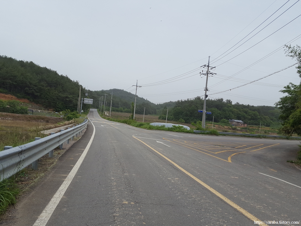 도로가 중간에 오수 마을로 가는 교차로를 만나지만 길은 언덕길로 직진한다.