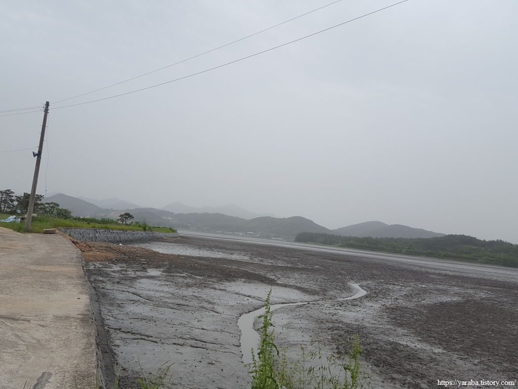 길을 돌아서 갯벌 길을 보니 끝이 보이지 않을 정도다. 위성 지도에서 거리를 측정해 보면 5백 미터가 넘는 길이다. 저 길을 뻘과 씨름하며 걸어갈 것을 생각하면 작업장에 도착하기도 전에 체력이 방전되지 않을까 싶다. 전동 스쿠터를 몰고 가면 금방일 테니 이곳에서 삶을 일구어 가시는 분들에게는 없어서는 안 될 길이다.