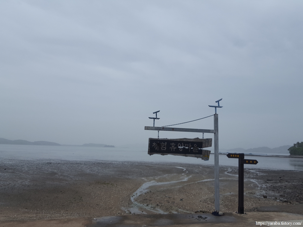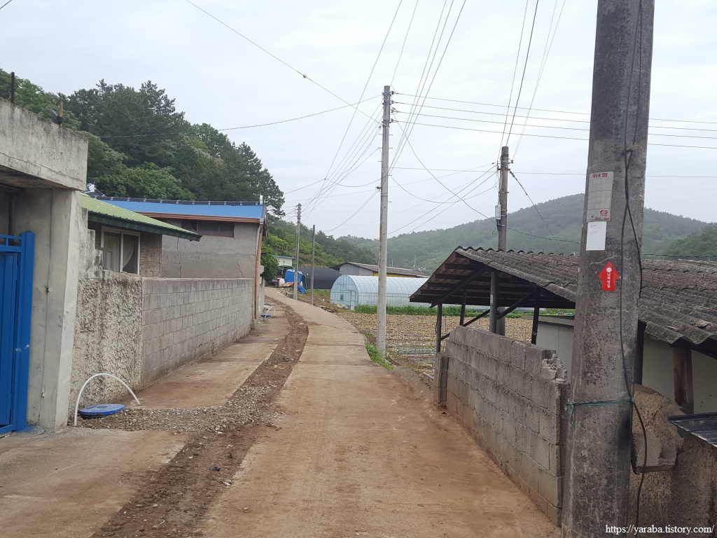 "푸르내로체험마을"이라는 이름으로 마을 펜션도 운영하고, 과일 따기 체험, 갯벌 체험 등도 운영하는 모양이었다. 솟대와 서있는 마을 안내 간판이 운치가 있다. 해변에서 좌측으로 가면 펜션이 있고 남파랑길은 우측 둘레길 방향으로 간다.