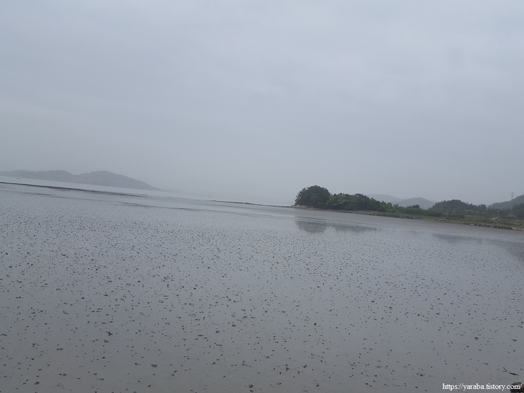 둑방길 좌측으로는 물이 빠지고 있어 거울처럼 빛나는 갯벌이 끝없이 이어지고 우측으로는 방조제로 생긴 논에서 모내기가 한창이다.
